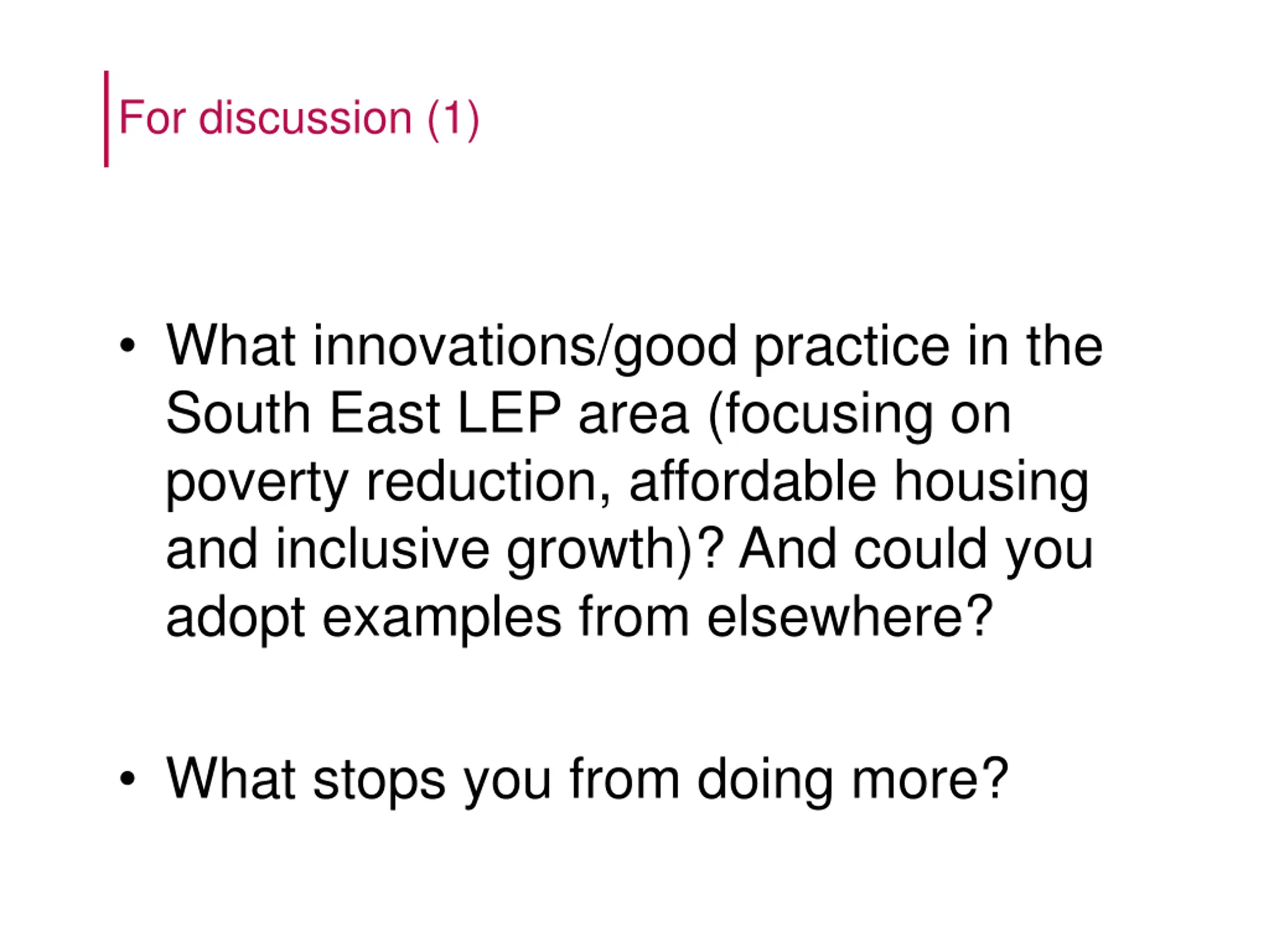 For discussion (1) What innovations/good practice in the South East LEP area (focusing on poverty reduction, affordable housing and inclusive growth)? And could you adopt examples from elsewhere? What stops you from doing more?