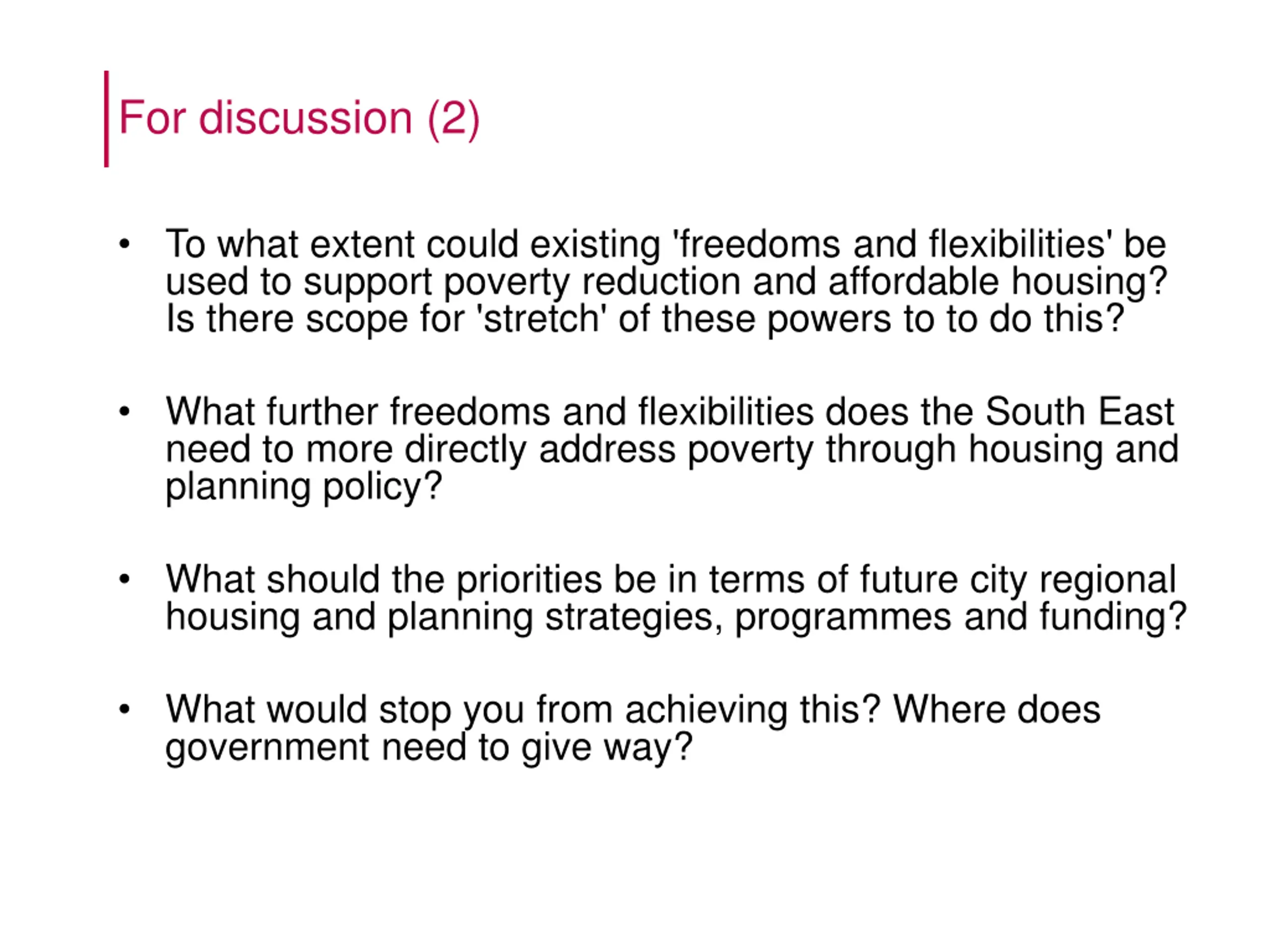 For discussion (2) To what extent could existing 'freedoms and flexibilities' be used to support poverty reduction and affordable housing? Is there scope for 'stretch' of these powers to to do this? What further freedoms and flexibilities does the South East need to more directly address poverty through housing and planning policy? What should the priorities be in terms of future city regional housing and planning strategies, programmes and funding? What would stop you from achieving this? Where does government need to give way?
