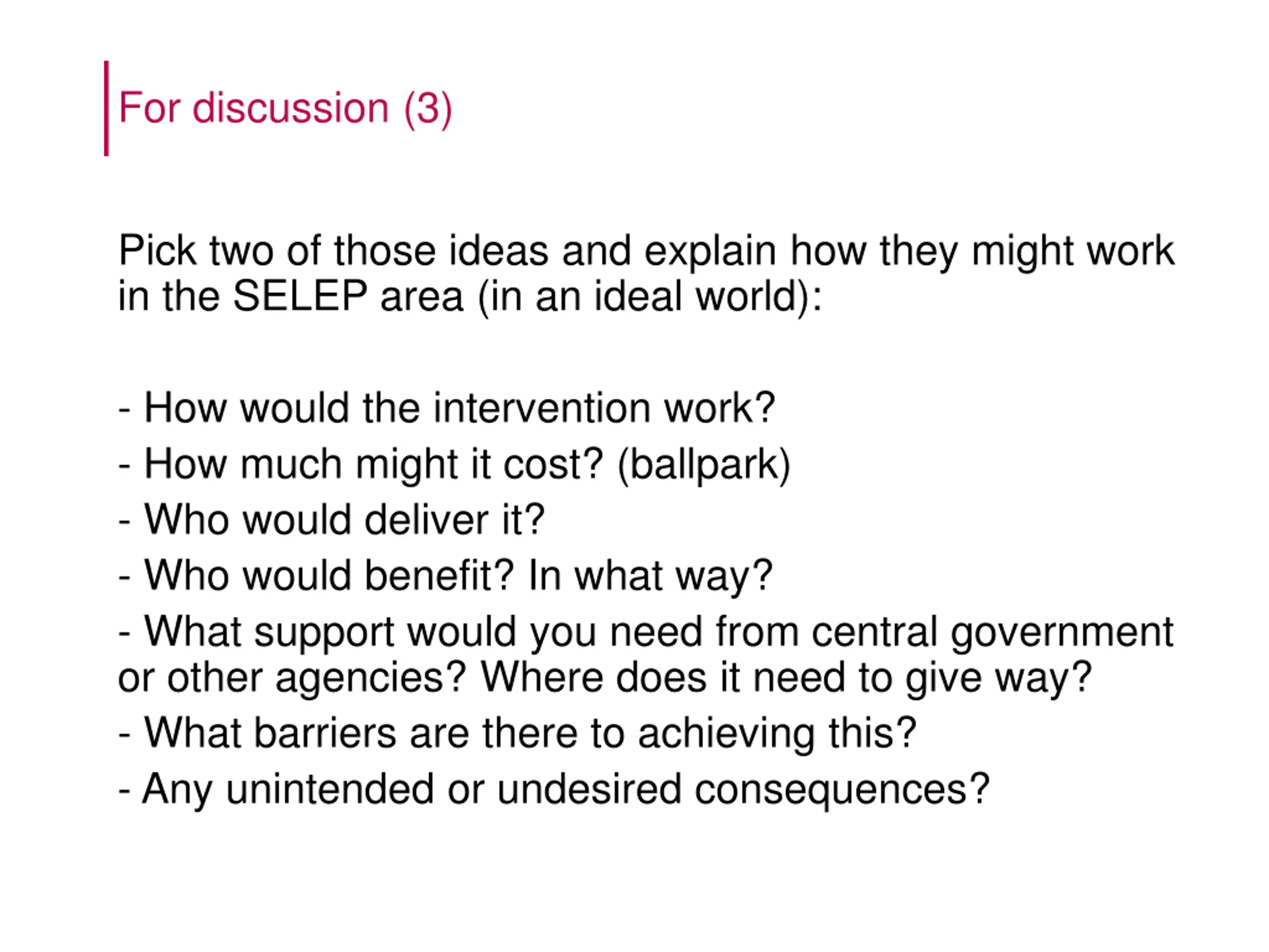 For discussion (3) Pick two of those ideas and explain how they might work in the SELEP area (in an ideal world): - How would the intervention work? - How much might it cost? (ballpark) - Who would deliver it? - Who would benefit? In what way? - What support would you need from central government or other agencies? Where does it need to give way? - What barriers are there to achieving this? - Any unintended or undesired consequences?