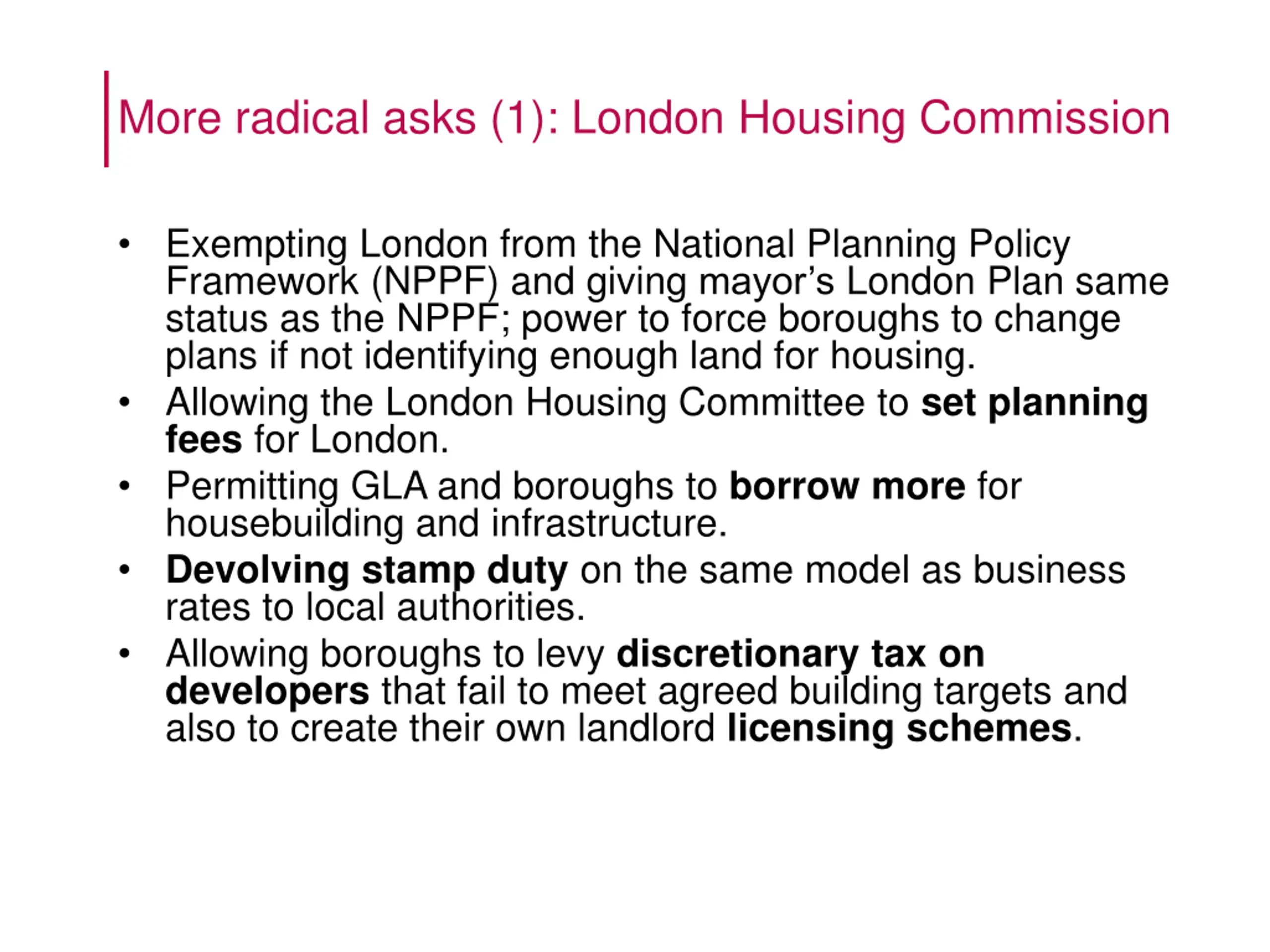 More radical asks (1): London Housing Commission Exempting London from the National Planning Policy Framework (NPPF) and giving mayor s London Plan same status as the NPPF; power to force boroughs to change plans if not identifying enough land for housing. Allowing the London Housing Committee to set planning fees for London. Permitting GLA and boroughs to borrow more for housebuilding and infrastructure. Devolving stamp duty on the same model as business rates to local authorities. Allowing boroughs to levy discretionary tax on developers that fail to meet agreed building targets and also to create their own landlord licensing schemes.