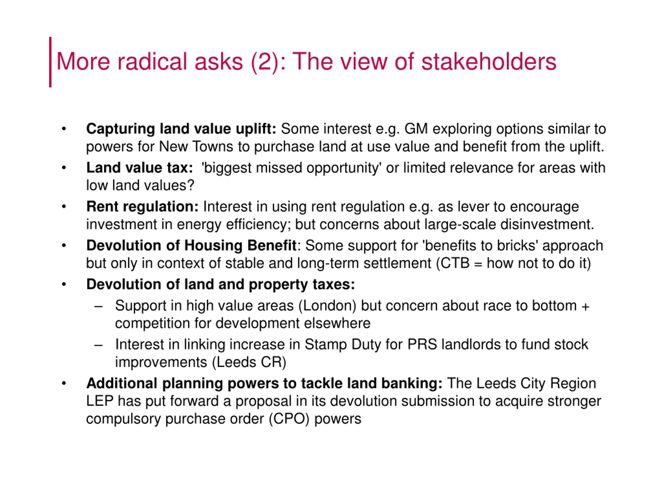 More radical asks (2): The view of stakeholders Capturing land value uplift: Some interest e.g. GM exploring options similar to powers for New Towns to purchase land at use value and benefit from the uplift. Land value tax: 'biggest missed opportunity' or limited relevance for areas with low land values? Rent regulation: Interest in using rent regulation e.g. as lever to encourage investment in energy efficiency; but concerns about large-scale disinvestment. Devolution of Housing Benefit: Some support for 'benefits to bricks' approach but only in context of stable and long-term settlement (CTB = how not to do it) Devolution of land and property taxes: Support in high value areas (London) but concern about race to bottom + competition for development elsewhere Interest in linking increase in Stamp Duty for PRS landlords to fund stock improvements (Leeds CR) Additional planning powers to tackle land banking: The Leeds City Region LEP has put forward a proposal in its devolution submission to acquire stronger compulsory purchase order (CPO) powers
