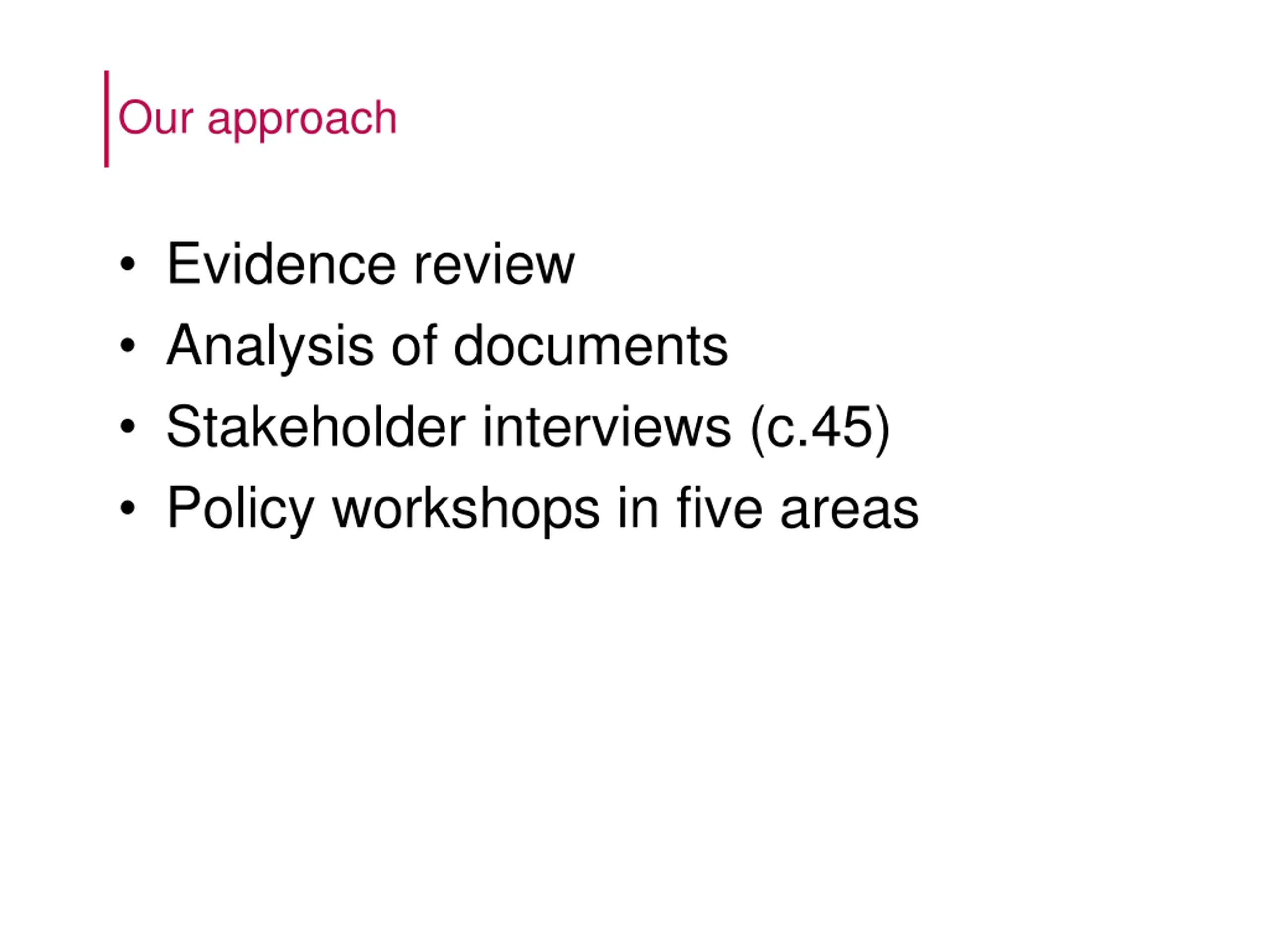 Our approach Evidence review Analysis of documents Stakeholder interviews (c.45) Policy workshops in five areas