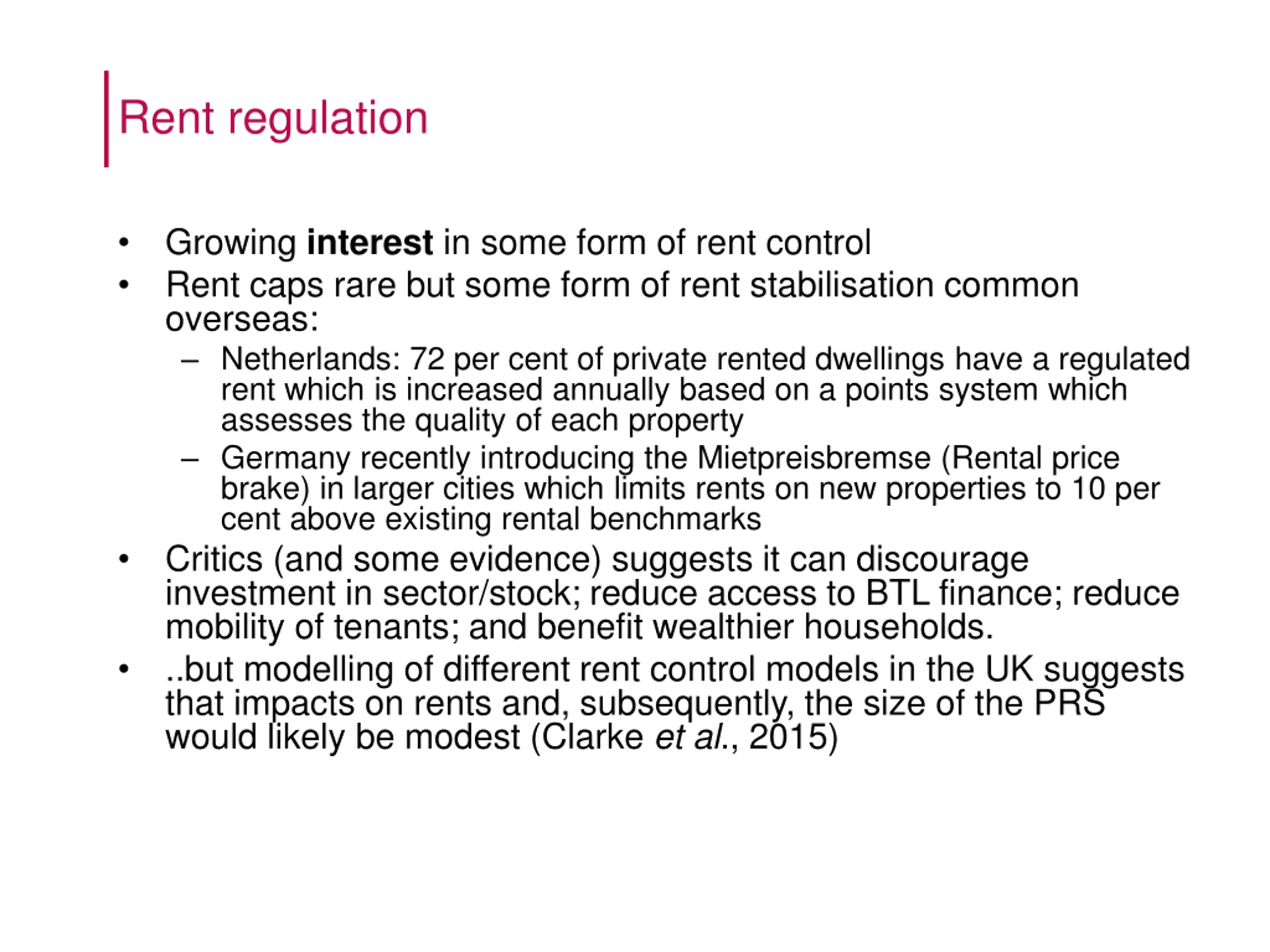 Rent regulation Growing interest in some form of rent control Rent caps rare but some form of rent stabilisation common overseas: Netherlands: 72 per cent of private rented dwellings have a regulated rent which is increased annually based on a points system which assesses the quality of each property Germany recently introducing the Mietpreisbremse (Rental price brake) in larger cities which limits rents on new properties to 10 per cent above existing rental benchmarks Critics (and some evidence) suggests it can discourage investment in sector/stock; reduce access to BTL finance; reduce mobility of tenants; and benefit wealthier households. ..but modelling of different rent control models in the UK suggests that impacts on rents and, subsequently, the size of the PRS would likely be modest (Clarke et al., 2015)