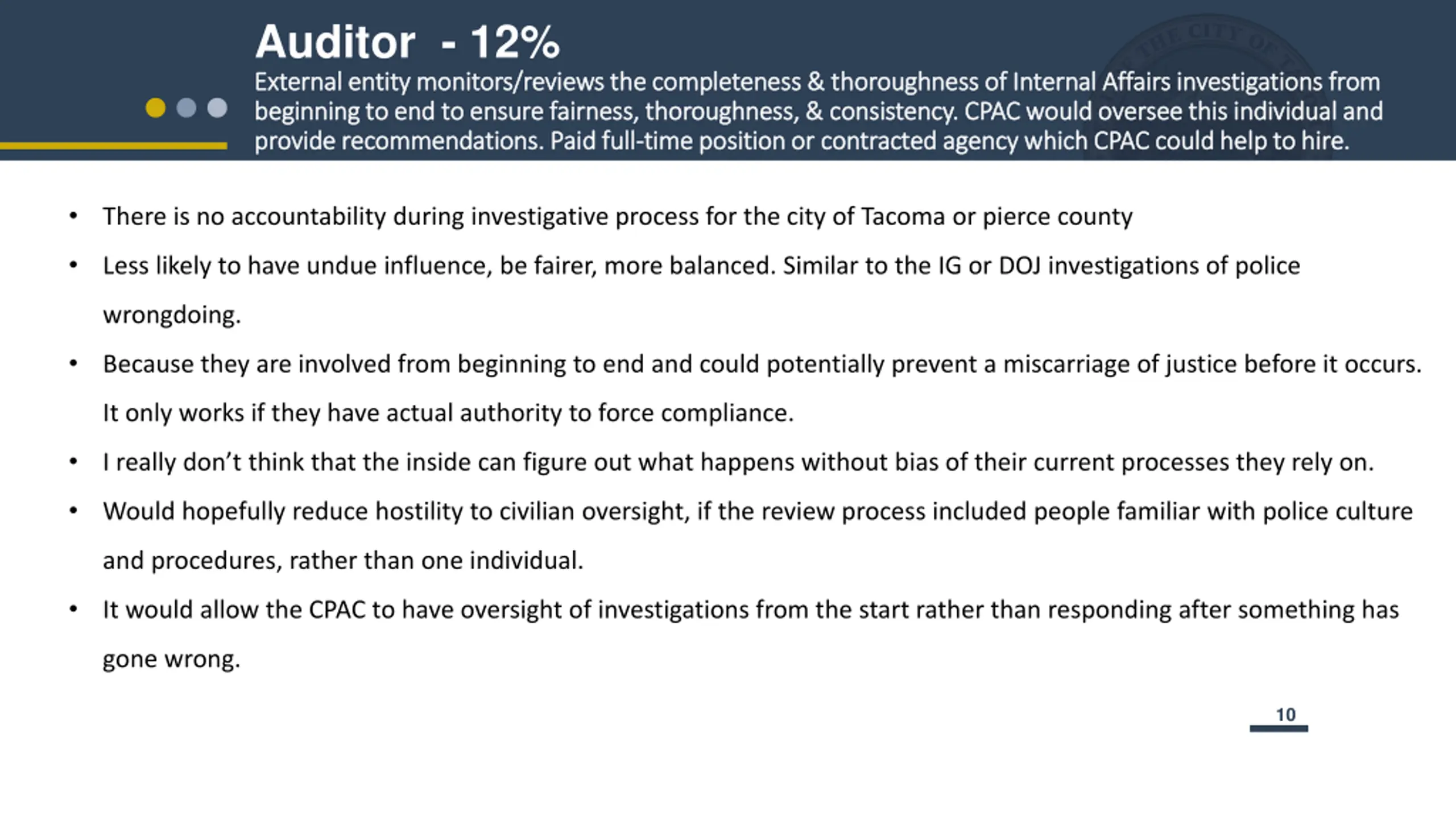 Auditor - 12% External entity External entity monitors/reviews the completeness & thoroughness of Internal Affairs investigations from monitors/reviews the completeness & thoroughness of Internal Affairs investigations from beginning to end to ensure fairness, thoroughness, & consistency. CPAC would oversee this individual and beginning to end to ensure fairness, thoroughness, & consistency. CPAC would oversee this individual and provide recommendations. Paid full provide recommendations. Paid full- -time position or contracted agency which CPAC could help to hire. time position or contracted agency which CPAC could help to hire. There is no accountability during investigative process for the city of Tacoma or pierce county Less likely to have undue influence, be fairer, more balanced. Similar to the IG or DOJ investigations of police wrongdoing. Because they are involved from beginning to end and could potentially prevent a miscarriage of justice before it occurs. It only works if they have actual authority to force compliance. I really don t think that the inside can figure out what happens without bias of their current processes they rely on. Would hopefully reduce hostility to civilian oversight, if the review process included people familiar with police culture and procedures, rather than one individual. It would allow the CPAC to have oversight of investigations from the start rather than responding after something has gone wrong. 10 10