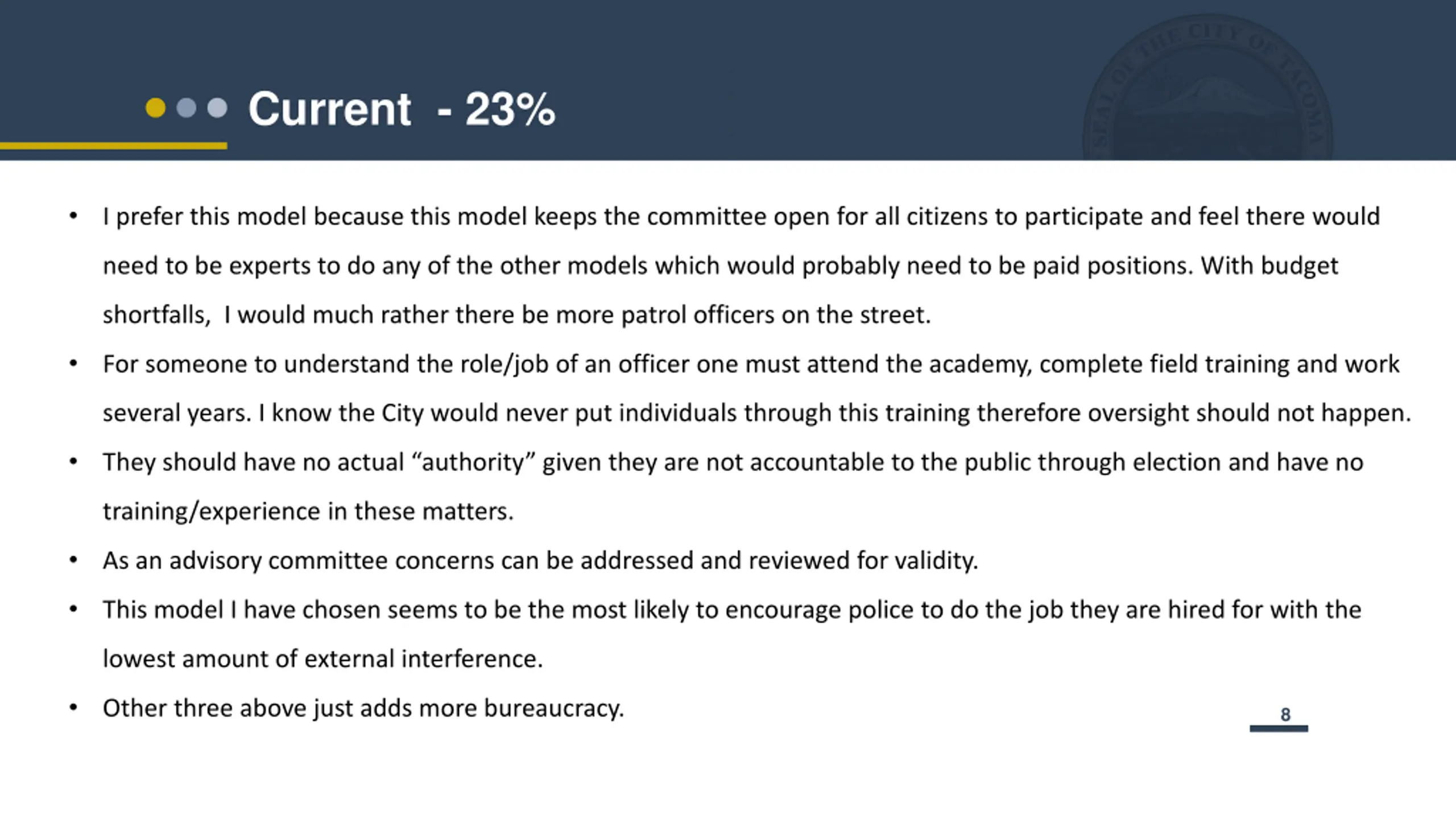 Investigative - 46% CPAC CPAC complaints of misconduct themselves and disciplines officers directly. Highest level of complaints of misconduct themselves and disciplines officers directly. Highest level of oversight; can take years to implement oversight; can take years to implement Despite the difficulties in setting it up, it seems the investigative model is the ideal final goal. This gives the CPAC more teeth. Instead of telling police they didn t hold themselves accountable enough, this model allows the citizens a direct path to redress independent of the department s desire to shield their own. Actual authority for actual oversight. External auditory might be fine too. I believe in local law enforcement should be transparent and held responsible for misconduct. Having an external committee conduct investigations would be a good step in the right direction for Tacoma. CPAC as it exists is useless. Actual oversight would be worth the bargaining and time investment to have actual change. All the other models seem to be another form of status quo. If the police, the city and the union members are serious about transparency, community oversight and oversight, they can't continue depending on volunteers to get the job done or use that board to hide. It needs to be a serious entity with compensated community members and training. 77