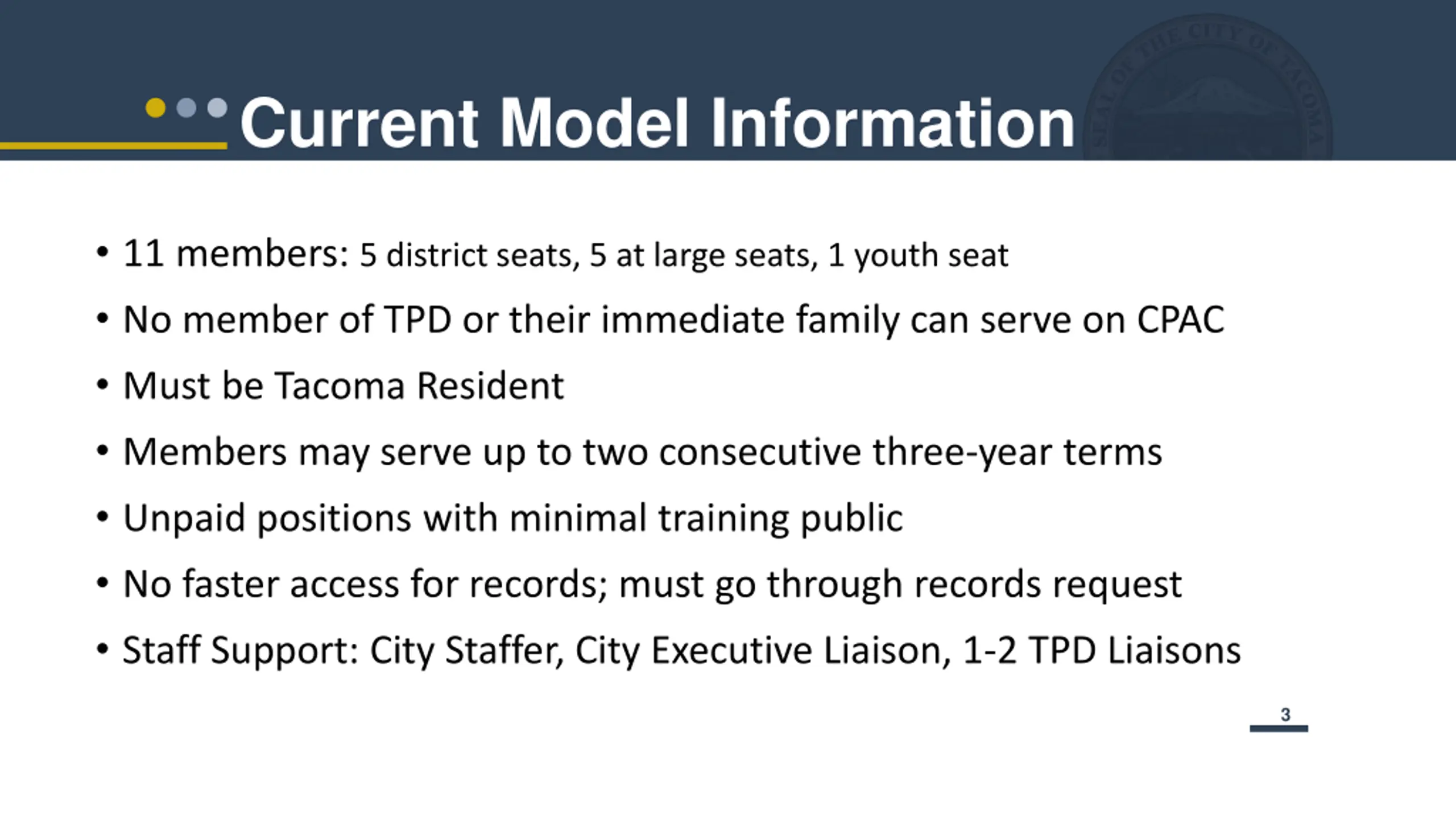 Current Model Information 11 members: 5 district seats, 5 at large seats, 1 youth seat No member of TPD or their immediate family can serve on CPAC Must be Tacoma Resident Members may serve up to two consecutive three-year terms Unpaid positions with minimal training public No faster access for records; must go through records request Staff Support: City Staffer, City Executive Liaison, 1-2 TPD Liaisons 33