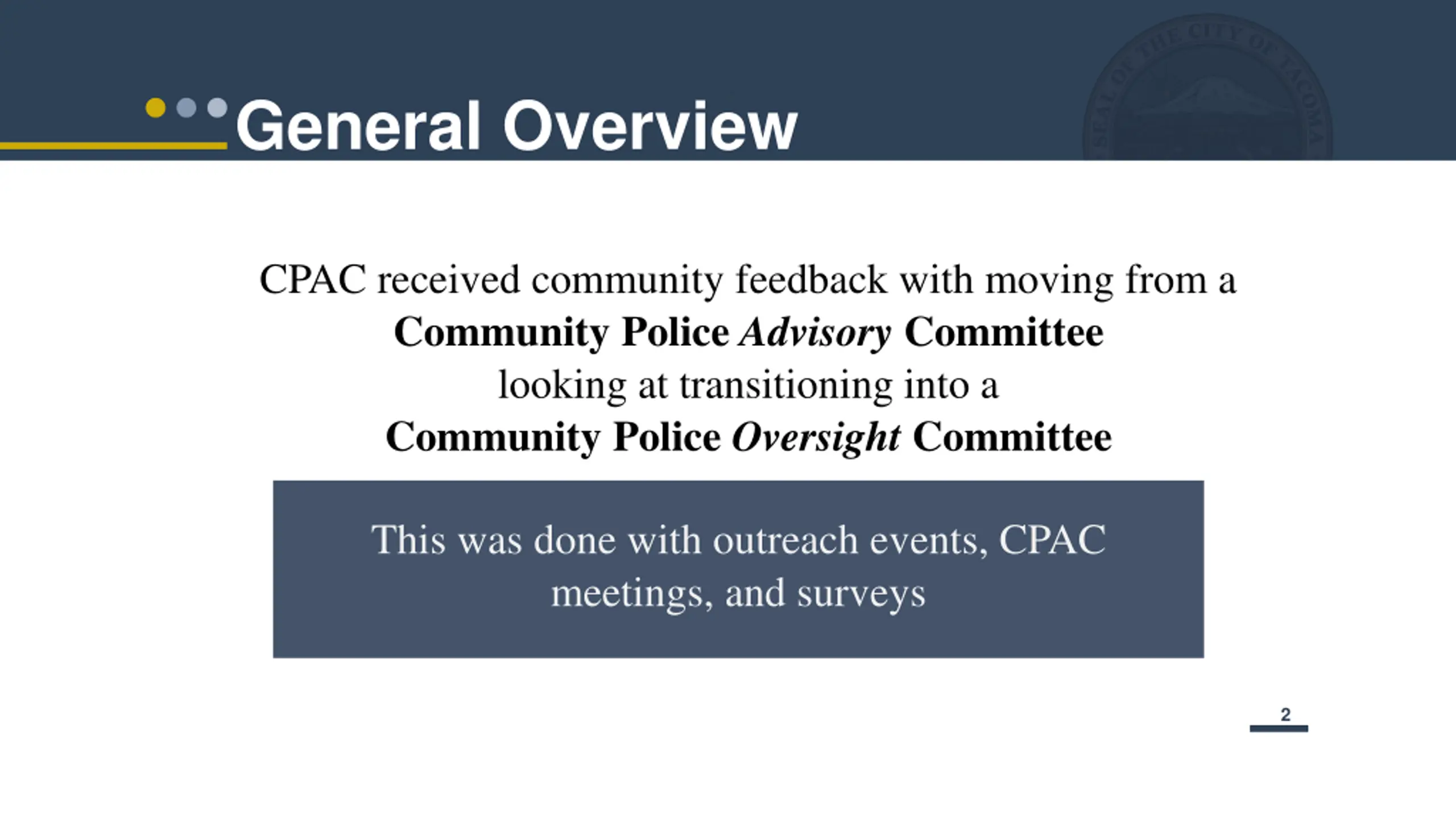 General Overview CPAC received community feedback with moving from a Community Police Advisory Committee looking at transitioning into a Community Police Oversight Committee This was done with outreach events, CPAC meetings, and surveys 22