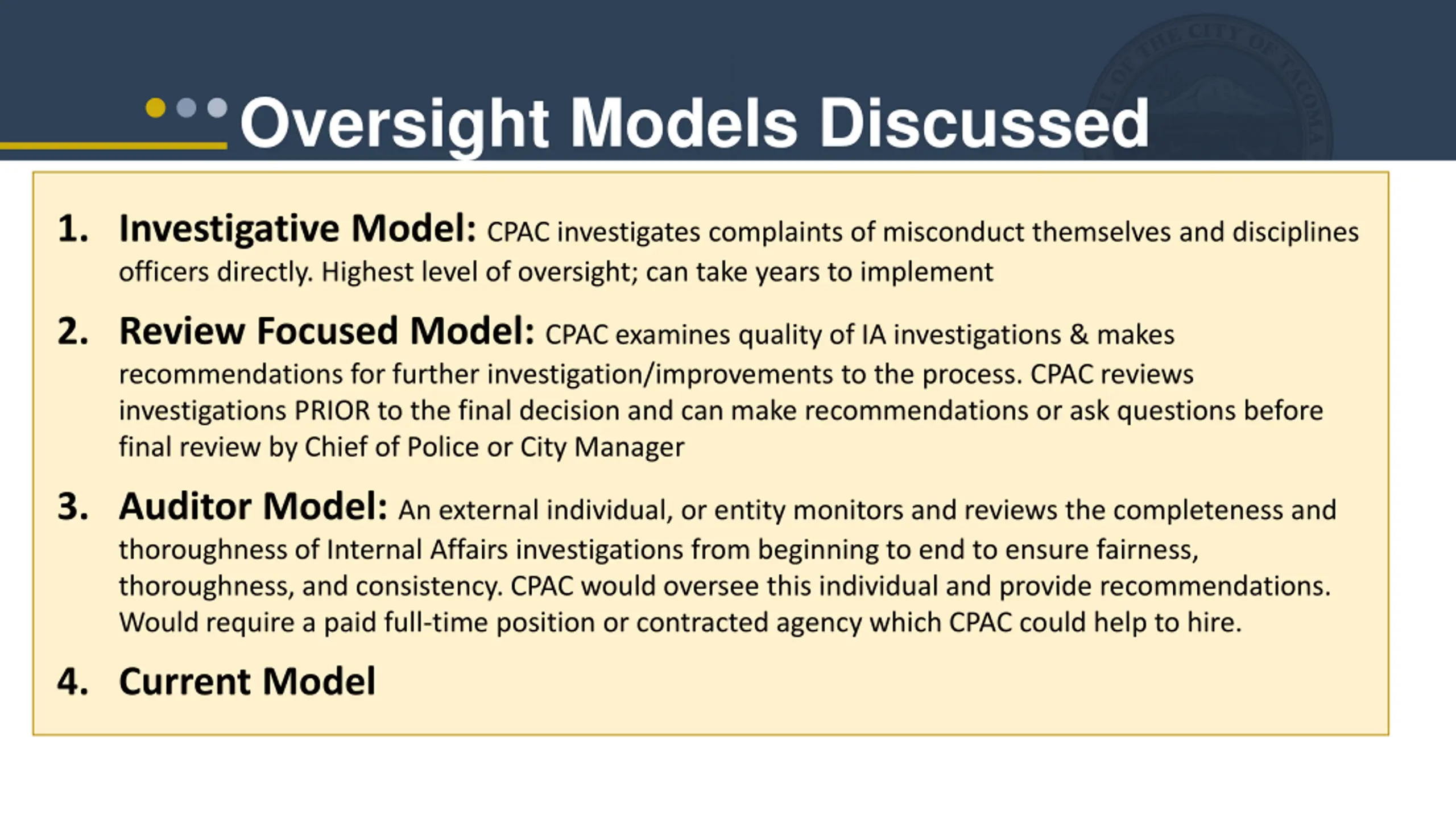 Explore the current oversight model and potential changes discussed by Tacoma's Community Police Advisory Committee (CPAC). Survey results reveal community preferences for oversight models. See images and details on Investigative, Review Focused, Auditor, and Current oversight models.