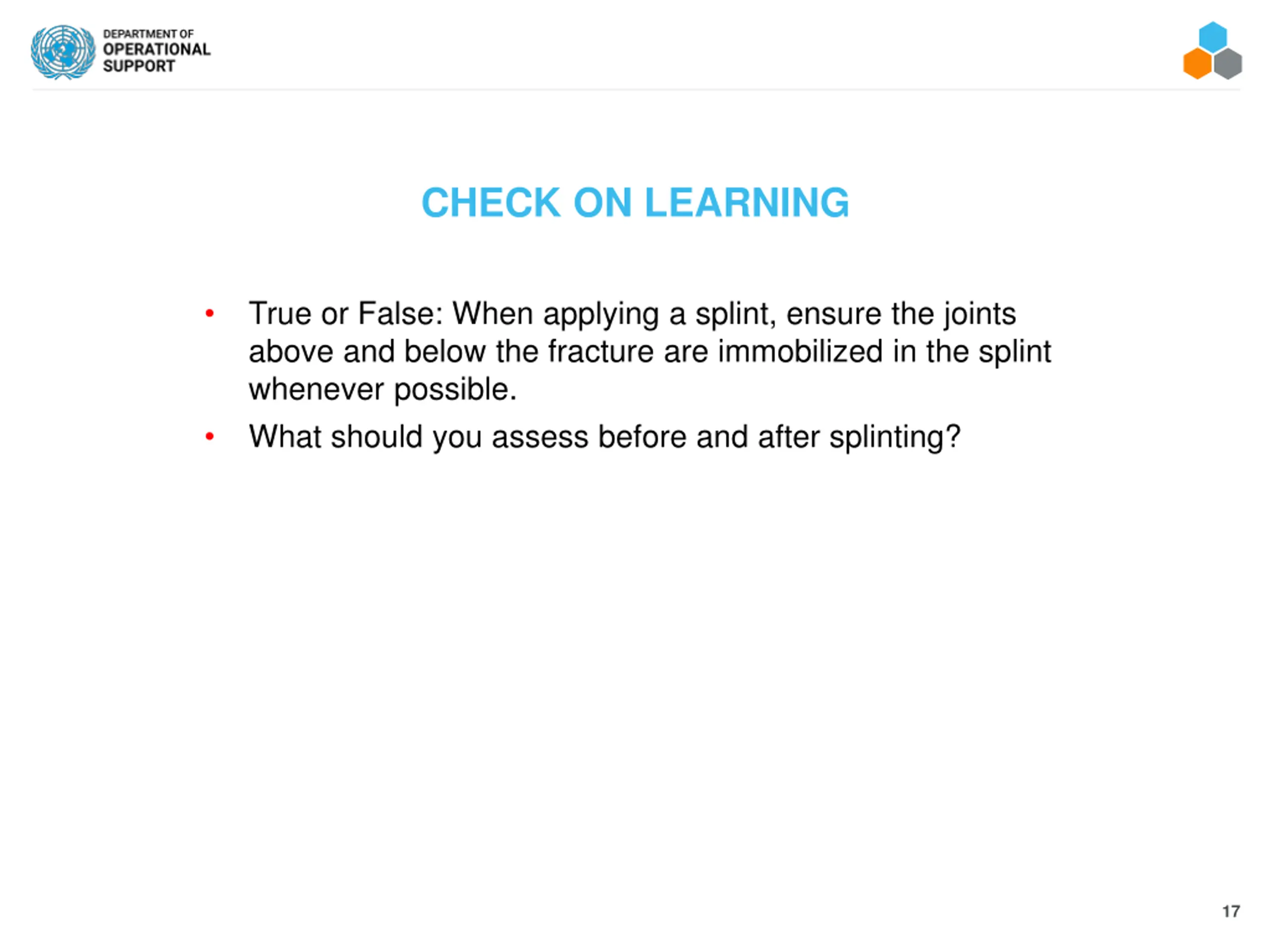 CHECK ON LEARNING True or False: When applying a splint, ensure the joints above and below the fracture are immobilized in the splint whenever possible. What should you assess before and after splinting? 17