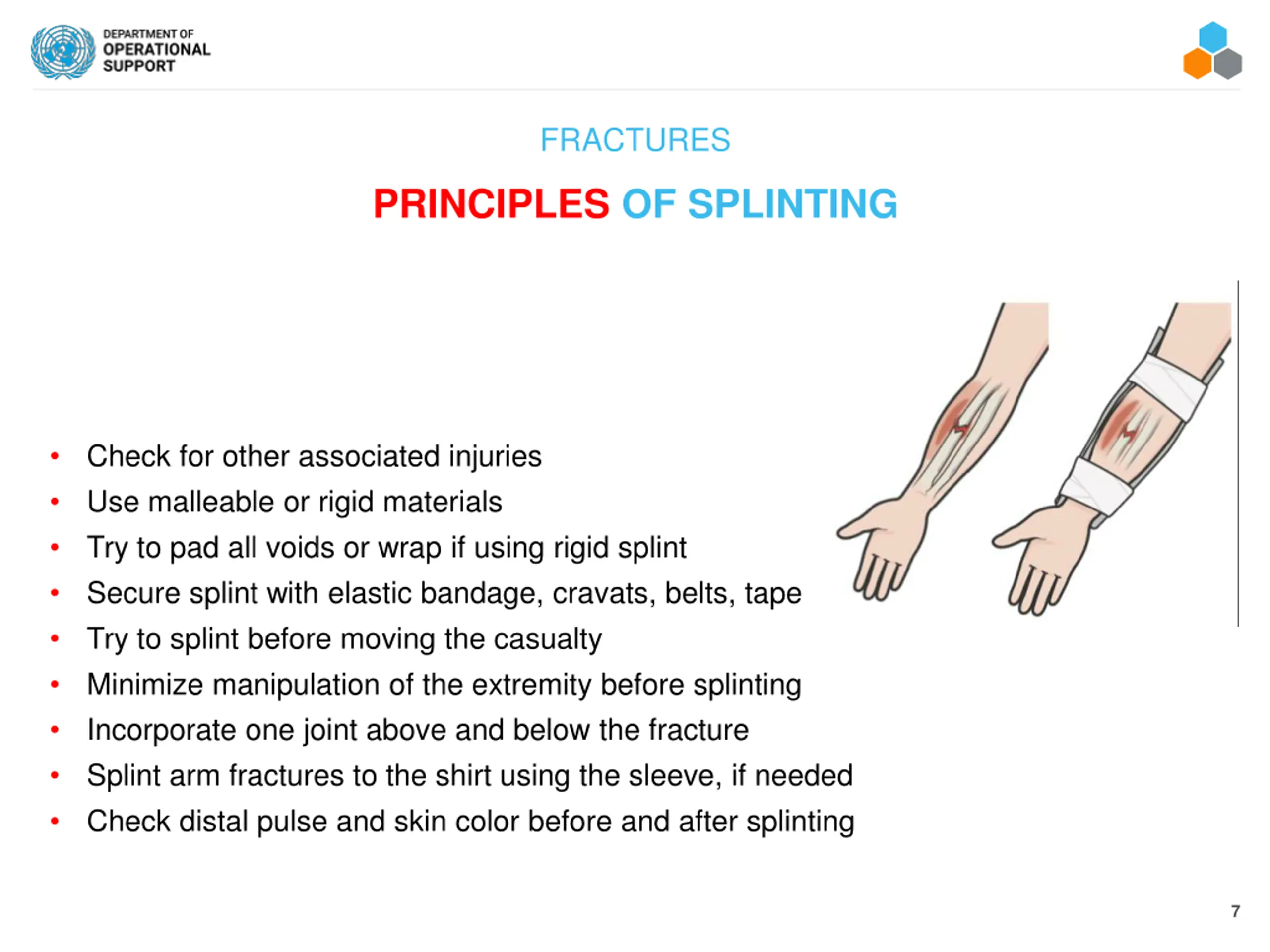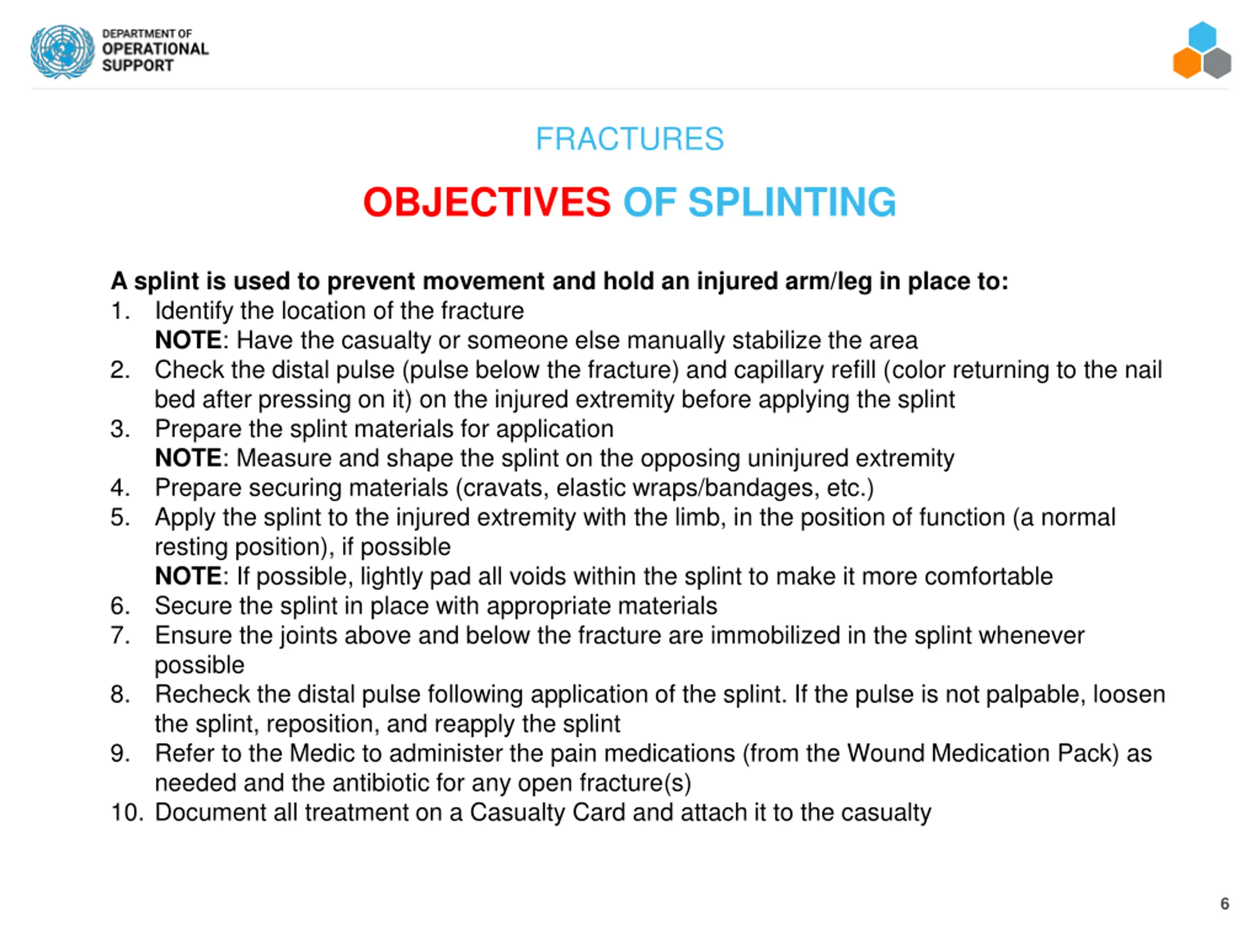 FRACTURES OBJECTIVES OF SPLINTING A splint is used to prevent movement and hold an injured arm/leg in place to: 1. Identify the location of the fracture NOTE: Have the casualty or someone else manually stabilize the area 2. Check the distal pulse (pulse below the fracture) and capillary refill (color returning to the nail bed after pressing on it) on the injured extremity before applying the splint 3. Prepare the splint materials for application NOTE: Measure and shape the splint on the opposing uninjured extremity 4. Prepare securing materials (cravats, elastic wraps/bandages, etc.) 5. Apply the splint to the injured extremity with the limb, in the position of function (a normal resting position), if possible NOTE: If possible, lightly pad all voids within the splint to make it more comfortable 6. Secure the splint in place with appropriate materials 7. Ensure the joints above and below the fracture are immobilized in the splint whenever possible 8. Recheck the distal pulse following application of the splint. If the pulse is not palpable, loosen the splint, reposition, and reapply the splint 9. Refer to the Medic to administer the pain medications (from the Wound Medication Pack) as needed and the antibiotic for any open fracture(s) 10. Document all treatment on a Casualty Card and attach it to the casualty 6