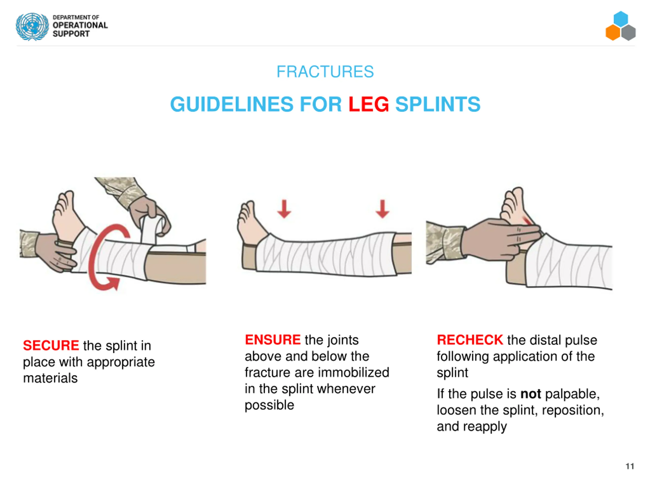 FRACTURES GUIDELINES FOR LEG SPLINTS ENSURE the joints above and below the fracture are immobilized in the splint whenever possible RECHECK the distal pulse following application of the splint If the pulse is not palpable, loosen the splint, reposition, and reapply SECURE the splint in place with appropriate materials 11