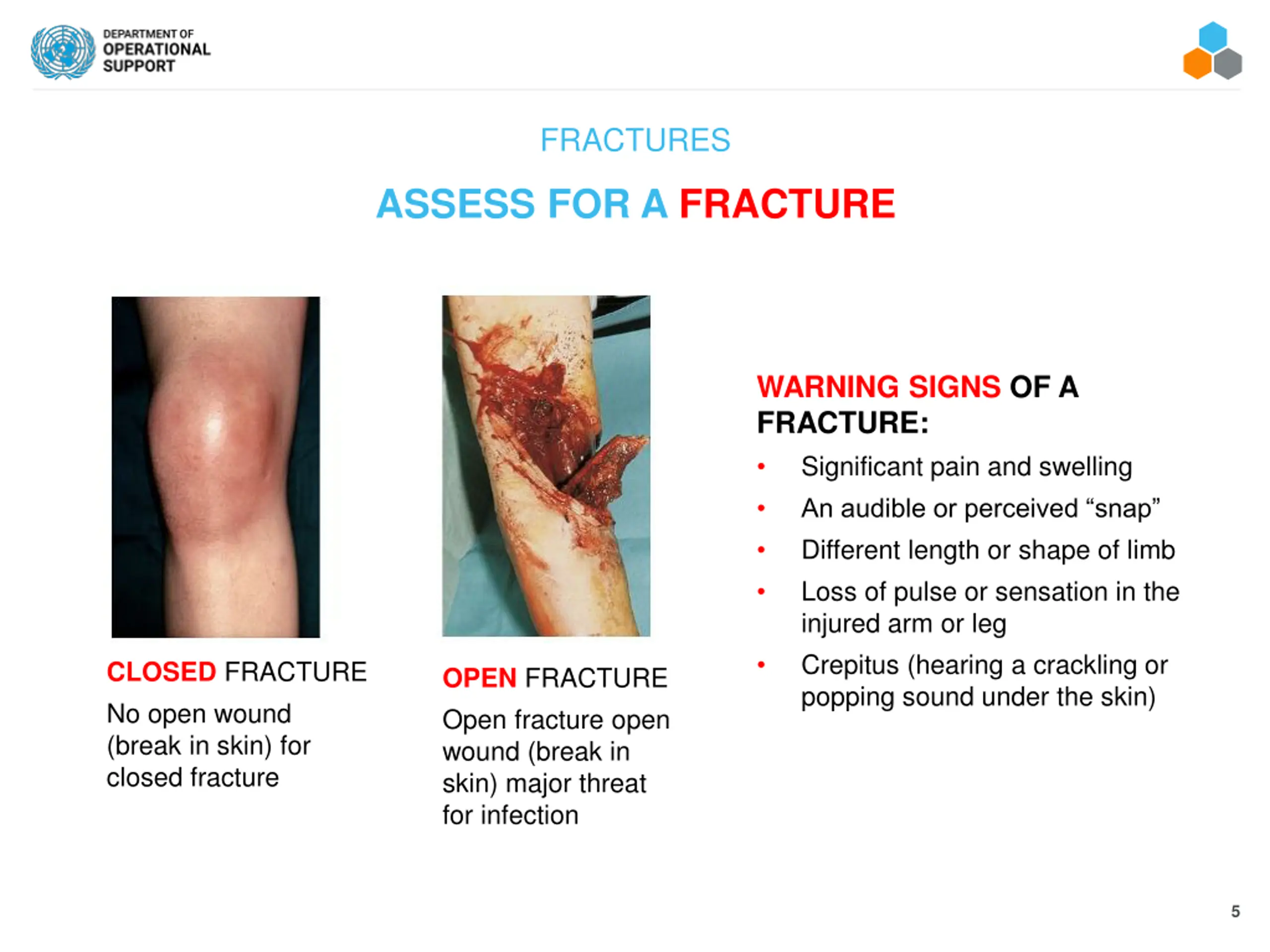 FRACTURES ASSESS FOR A FRACTURE WARNING SIGNS OF A FRACTURE: Significant pain and swelling An audible or perceived snap Different length or shape of limb Loss of pulse or sensation in the injured arm or leg Crepitus (hearing a crackling or popping sound under the skin) CLOSED FRACTURE No open wound (break in skin) for closed fracture OPEN FRACTURE Open fracture open wound (break in skin) major threat for infection 5