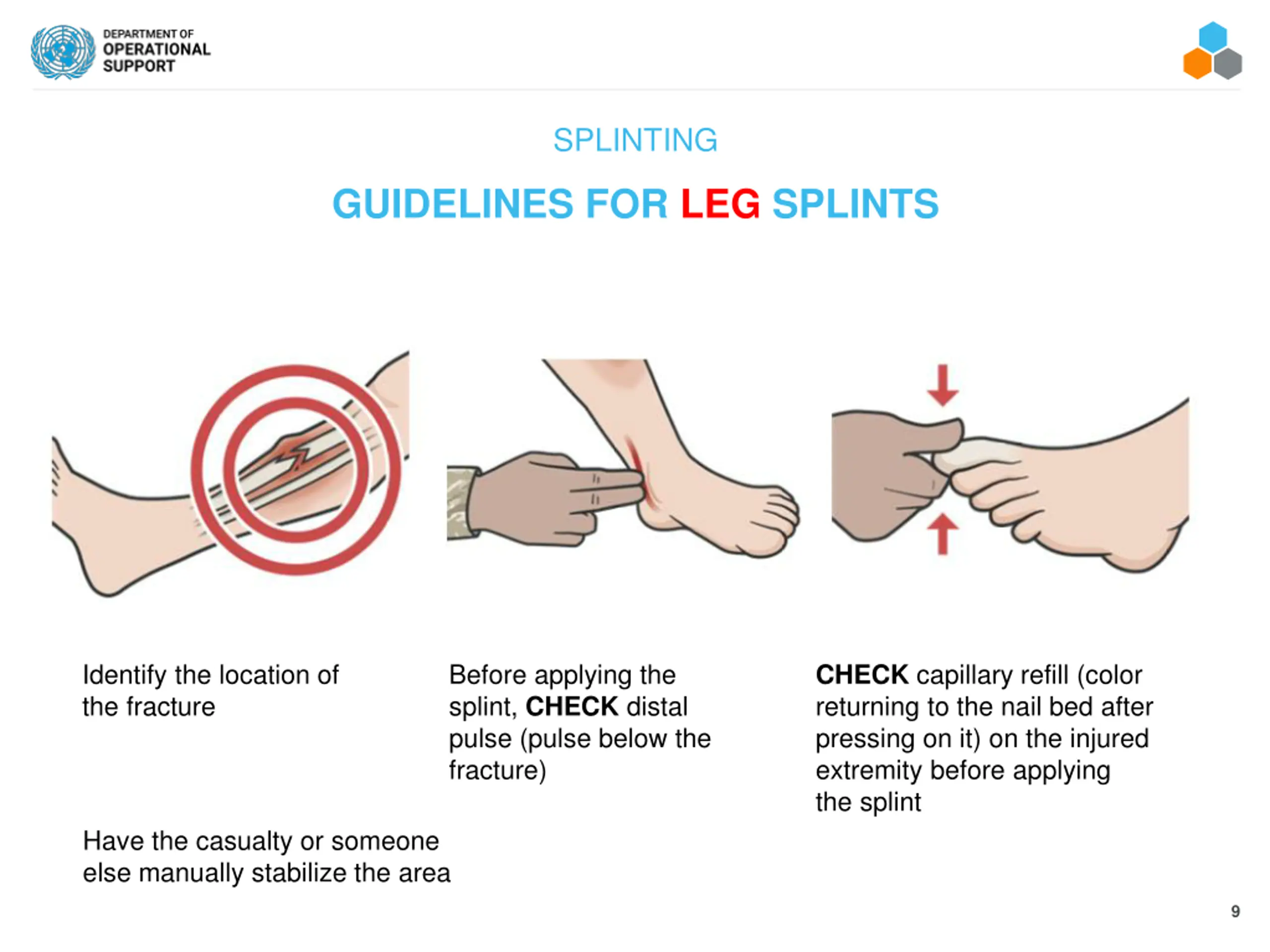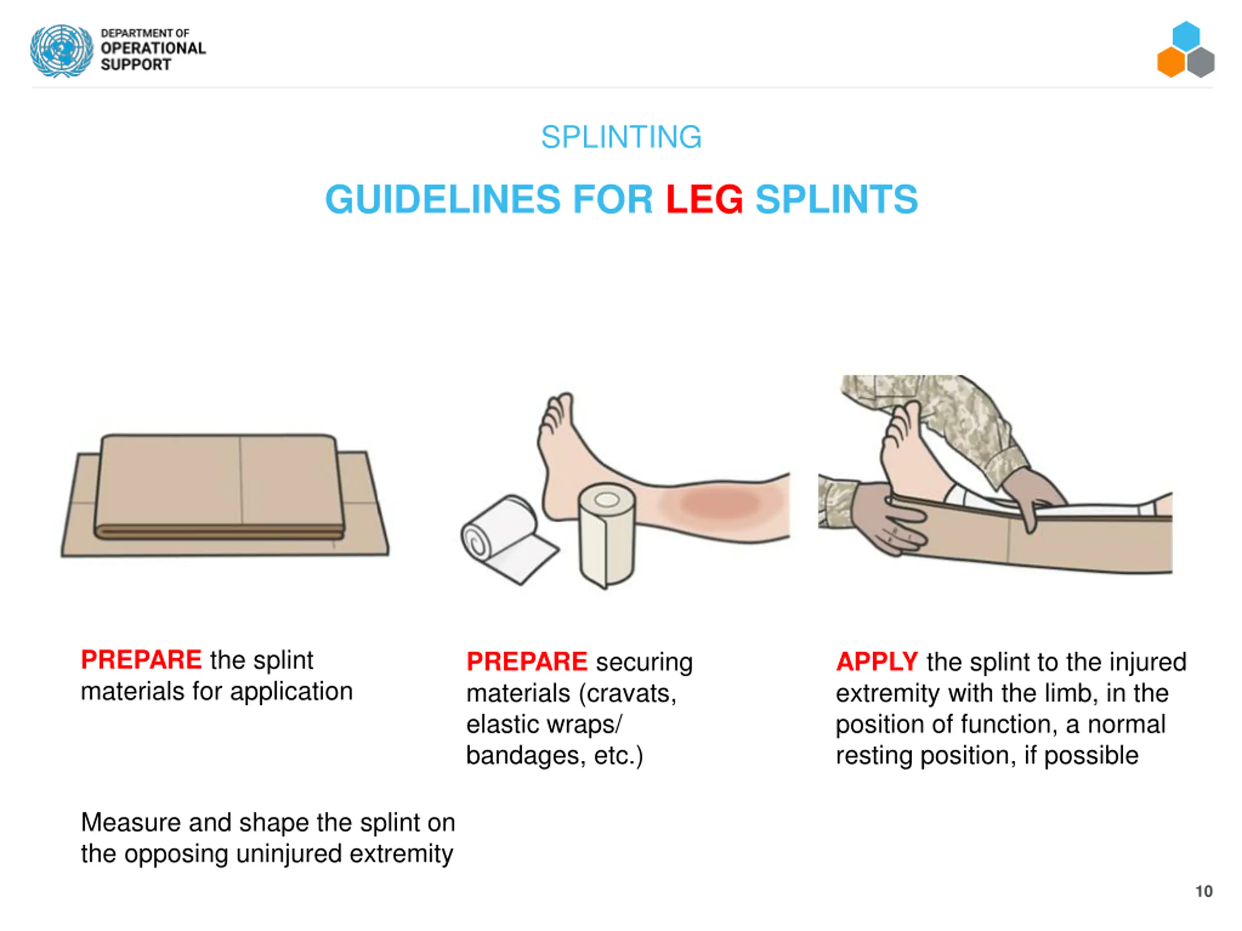 SPLINTING GUIDELINES FOR LEG SPLINTS Identify the location of the fracture Before applying the splint, CHECK distal pulse (pulse below the fracture) CHECK capillary refill (color returning to the nail bed after pressing on it) on the injured extremity before applying the splint Have the casualty or someone else manually stabilize the area 9