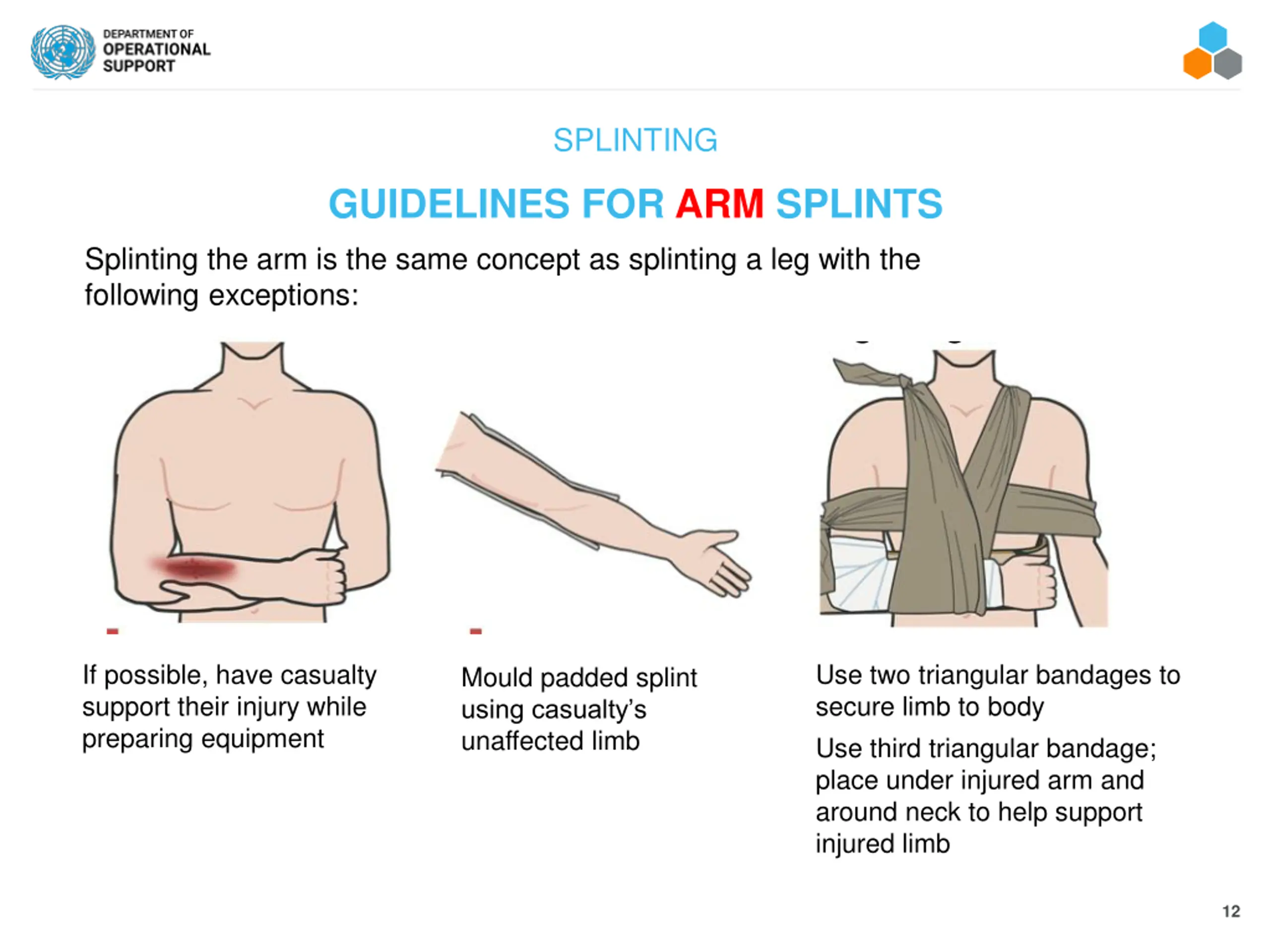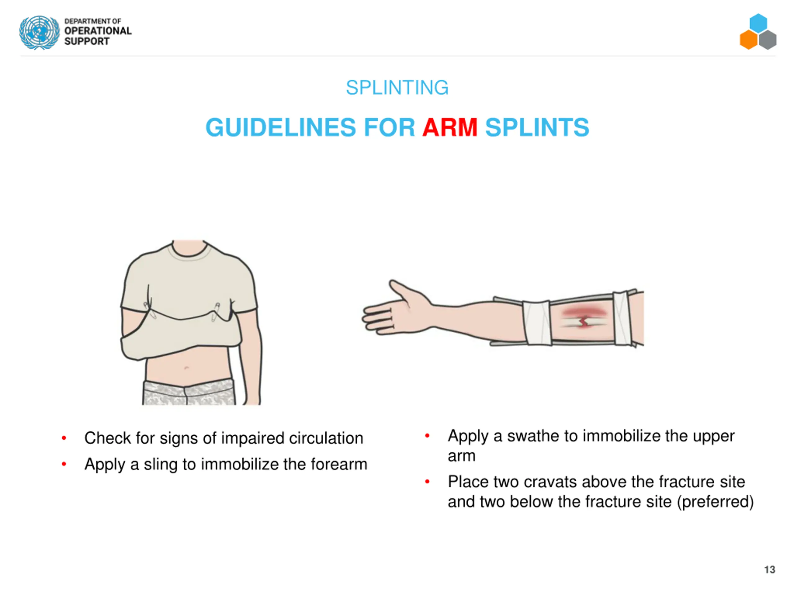 SPLINTING GUIDELINES FOR ARM SPLINTS Splinting the arm is the same concept as splinting a leg with the following exceptions: If possible, have casualty support their injury while preparing equipment Use two triangular bandages to secure limb to body Use third triangular bandage; place under injured arm and around neck to help support injured limb Mould padded splint using casualty s unaffected limb 12
