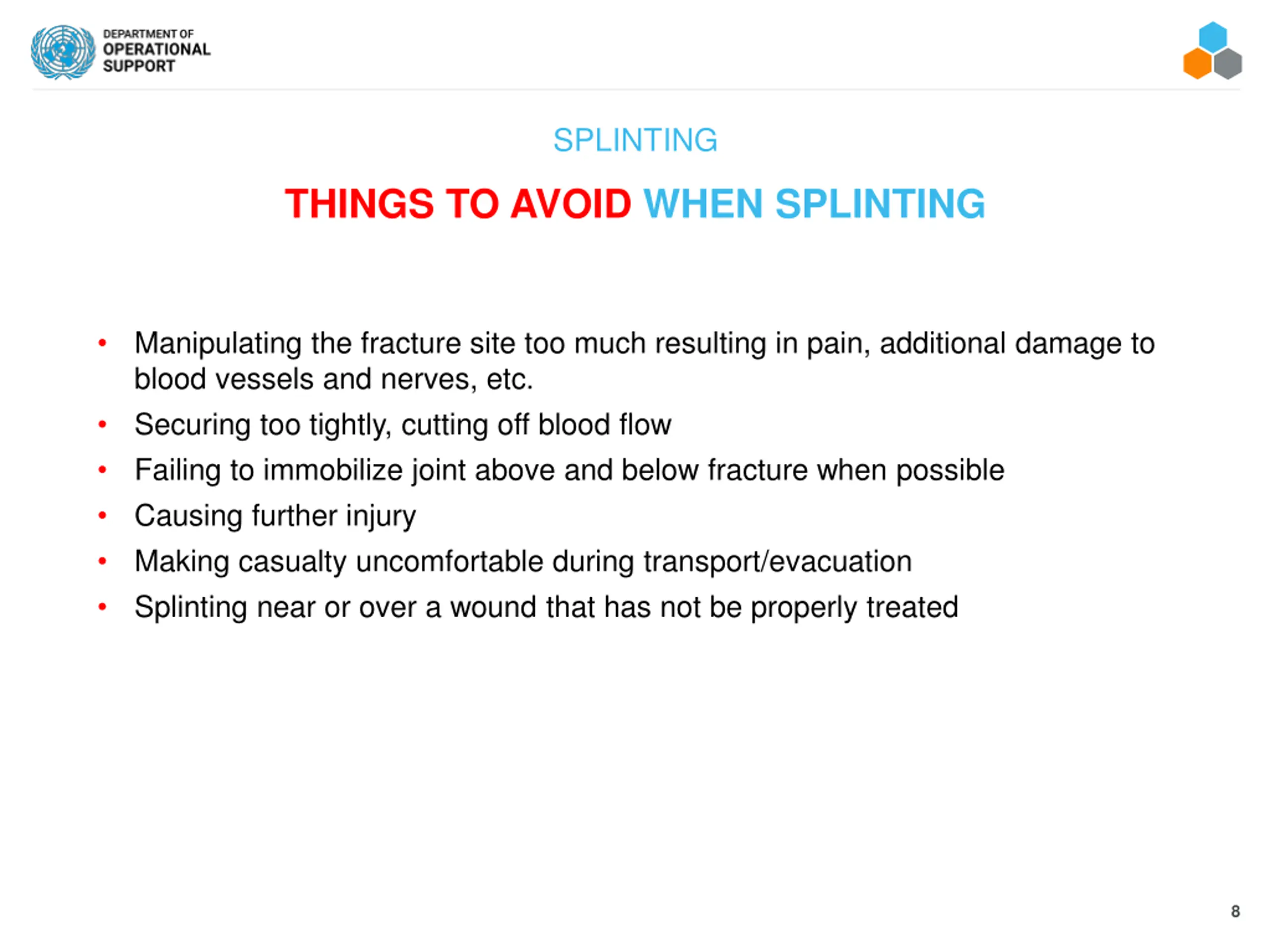 FRACTURES PRINCIPLES OF SPLINTING Check for other associated injuries Use malleable or rigid materials Try to pad all voids or wrap if using rigid splint Secure splint with elastic bandage, cravats, belts, tape Try to splint before moving the casualty Minimize manipulation of the extremity before splinting Incorporate one joint above and below the fracture Splint arm fractures to the shirt using the sleeve, if needed Check distal pulse and skin color before and after splinting 7