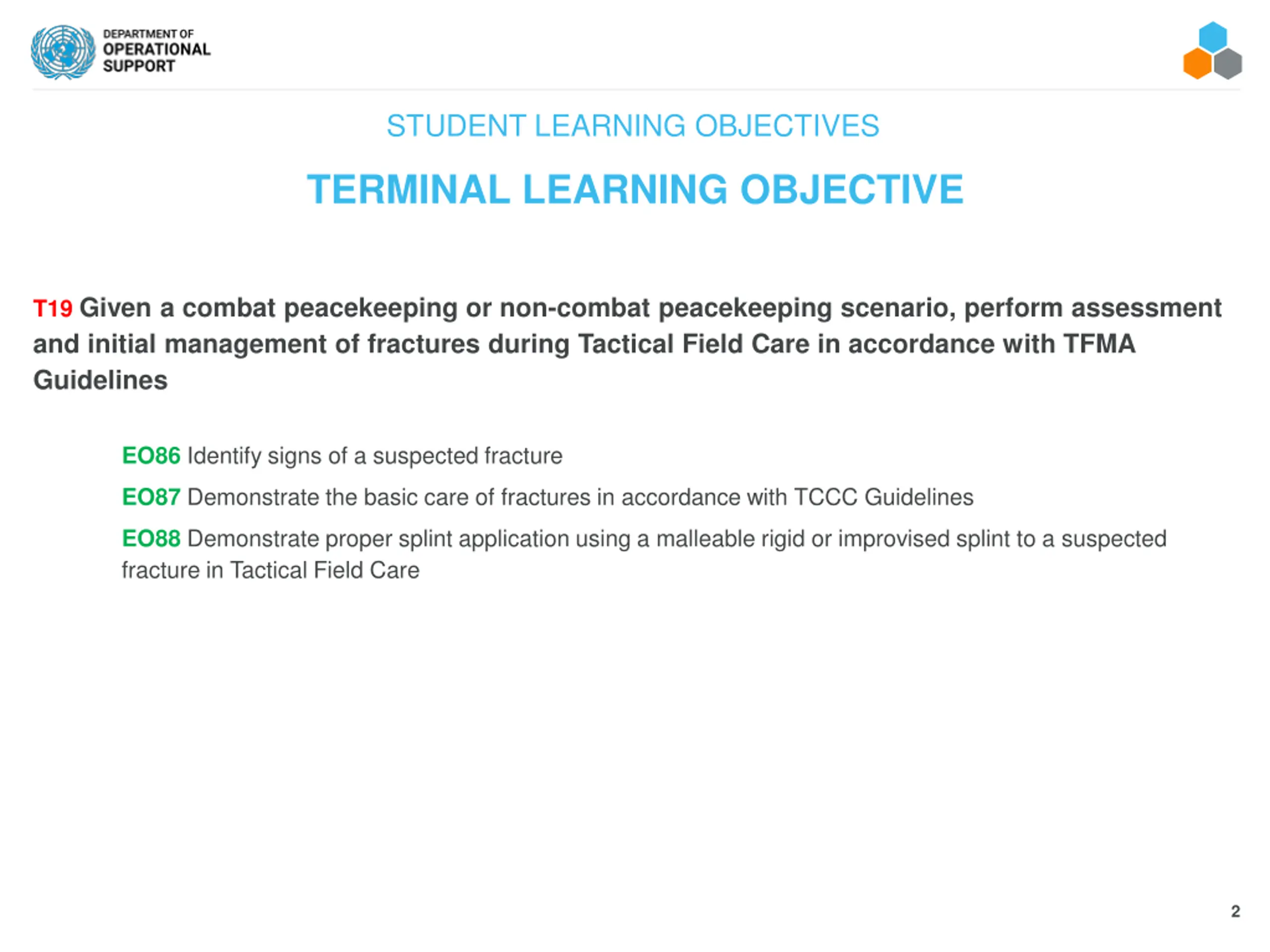 STUDENT LEARNING OBJECTIVES TERMINAL LEARNING OBJECTIVE T19 Given a combat peacekeeping or non-combat peacekeeping scenario, perform assessment and initial management of fractures during Tactical Field Care in accordance with TFMA Guidelines EO86 Identify signs of a suspected fracture EO87 Demonstrate the basic care of fractures in accordance with TCCC Guidelines EO88 Demonstrate proper splint application using a malleable rigid or improvised splint to a suspected fracture in Tactical Field Care 2