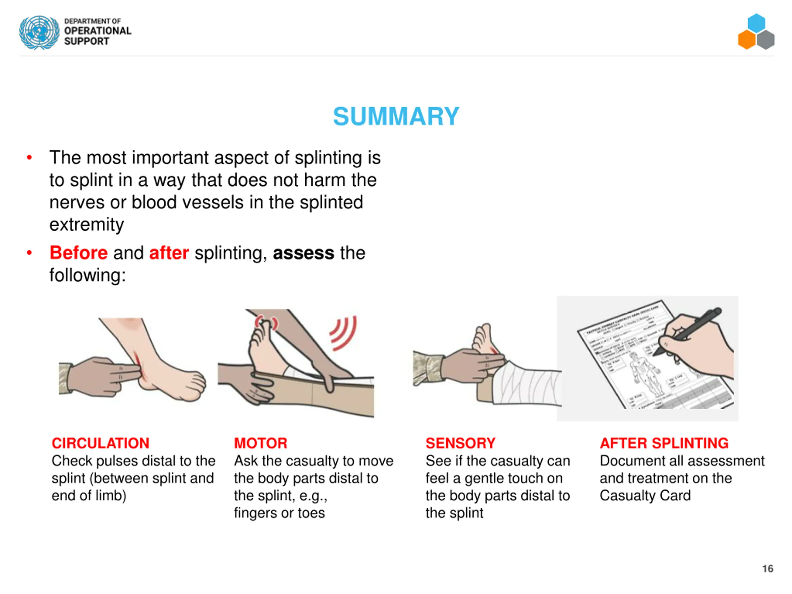 SUMMARY The most important aspect of splinting is to splint in a way that does not harm the nerves or blood vessels in the splinted extremity Before and after splinting, assess the following: CIRCULATION Check pulses distal to the splint (between splint and end of limb) MOTOR Ask the casualty to move the body parts distal to the splint, e.g., fingers or toes SENSORY See if the casualty can feel a gentle touch on the body parts distal to the splint AFTER SPLINTING Document all assessment and treatment on the Casualty Card 16