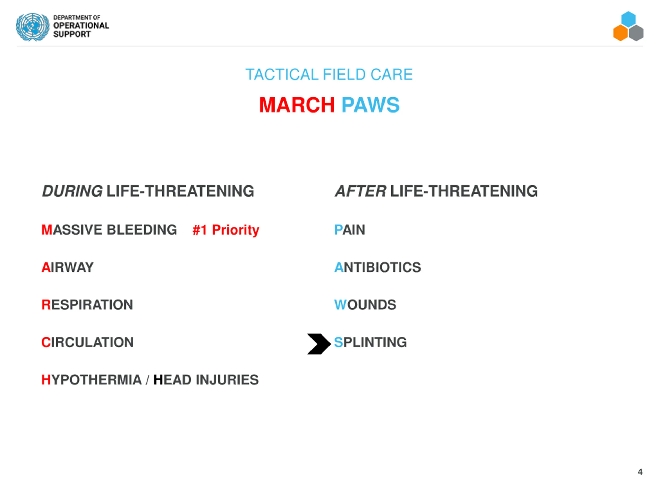 TACTICAL FIELD CARE MARCH PAWS DURING LIFE-THREATENING AFTER LIFE-THREATENING MASSIVE BLEEDING #1 Priority PAIN AIRWAY ANTIBIOTICS RESPIRATION WOUNDS CIRCULATION SPLINTING HYPOTHERMIA / HEAD INJURIES 4