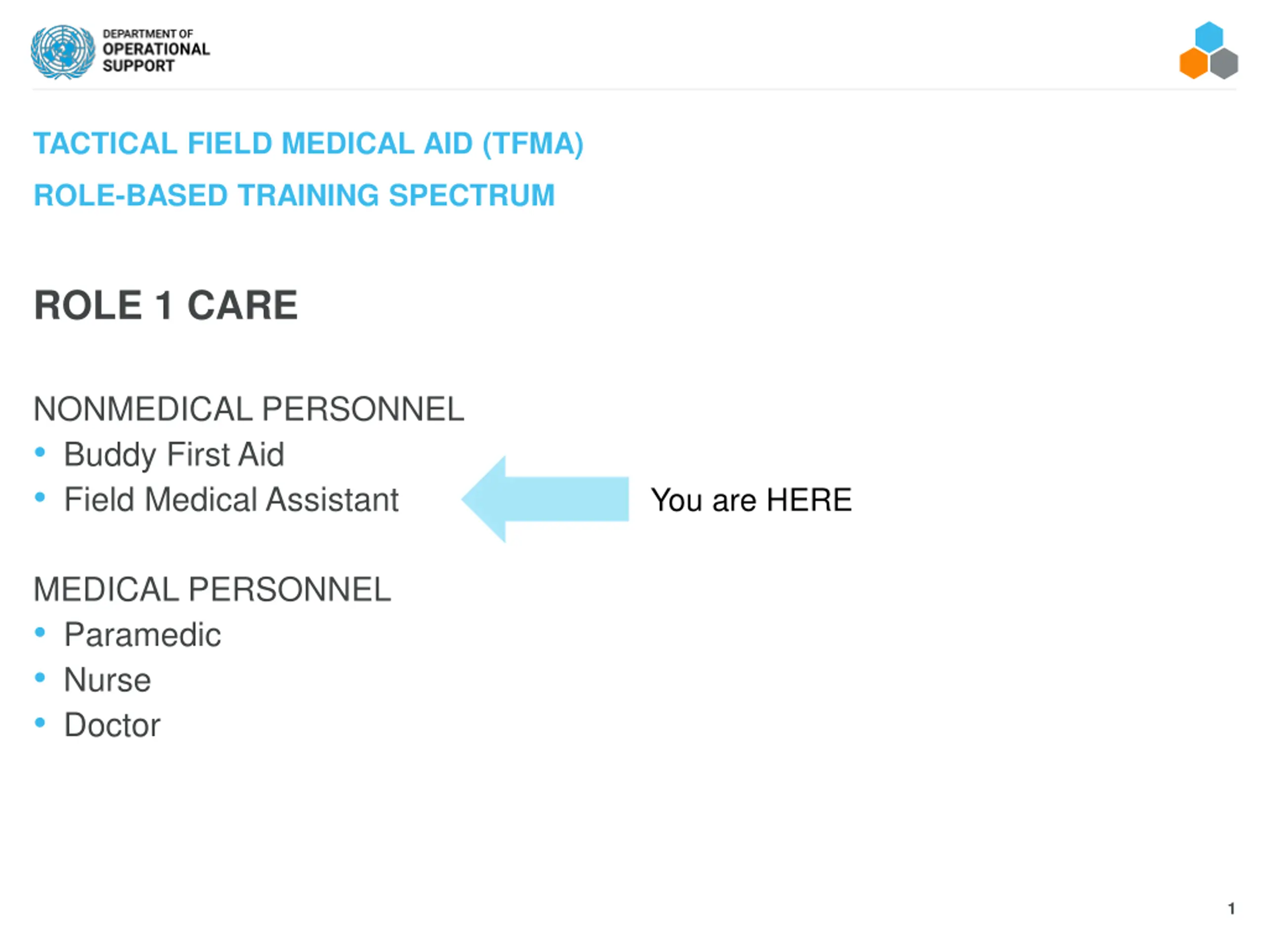 TACTICAL FIELD MEDICAL AID (TFMA) ROLE-BASED TRAINING SPECTRUM ROLE 1 CARE NONMEDICAL PERSONNEL Buddy First Aid Field Medical Assistant You are HERE MEDICAL PERSONNEL Paramedic Nurse Doctor 1
