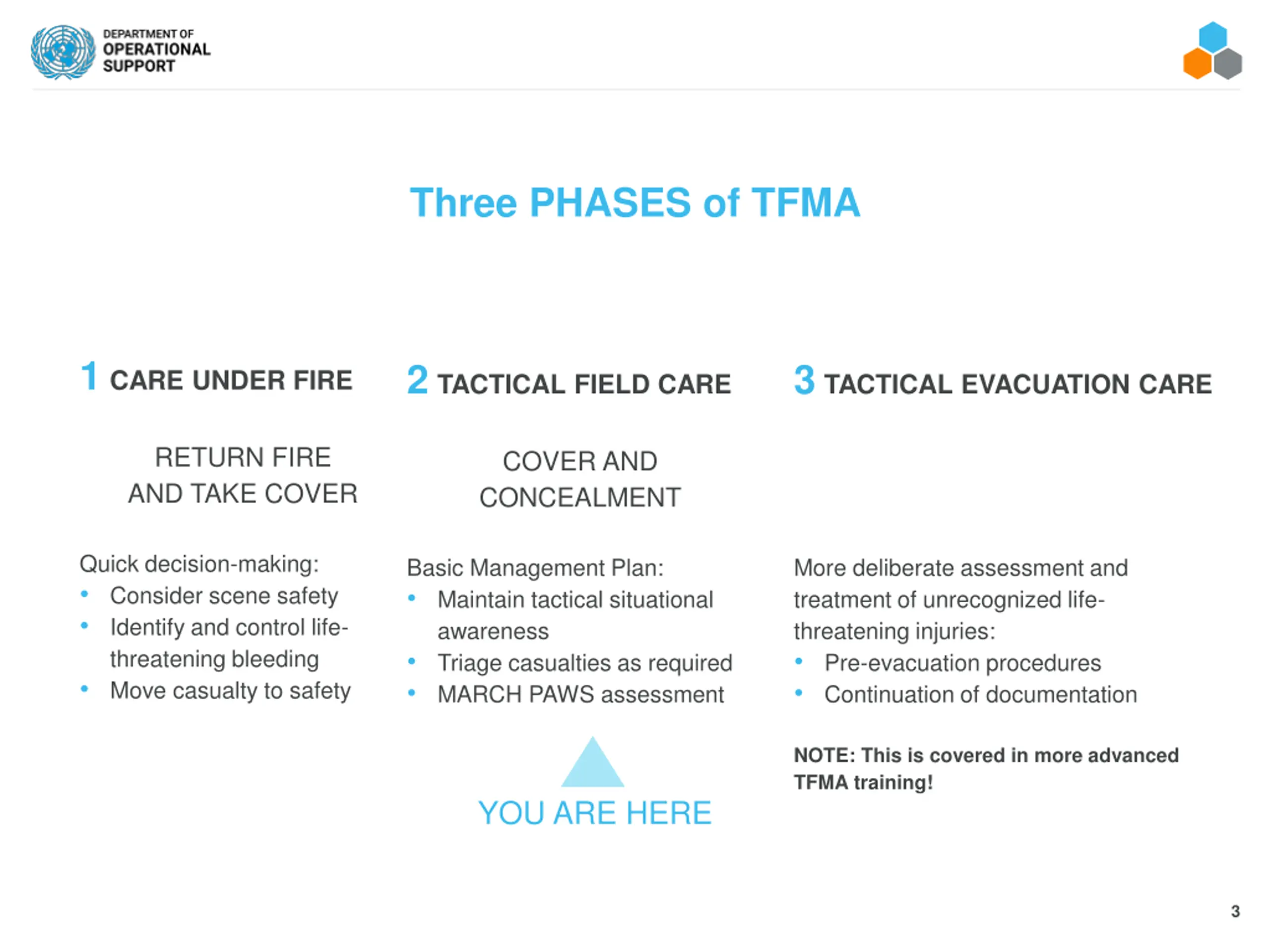 Three PHASES of TFMA 1CARE UNDER FIRE 2TACTICAL FIELD CARE 3TACTICAL EVACUATION CARE RETURN FIRE AND TAKE COVER COVER AND CONCEALMENT Quick decision-making: Consider scene safety Identify and control life- threatening bleeding Move casualty to safety Basic Management Plan: Maintain tactical situational awareness Triage casualties as required MARCH PAWS assessment More deliberate assessment and treatment of unrecognized life- threatening injuries: Pre-evacuation procedures Continuation of documentation NOTE: This is covered in more advanced TFMA training! YOU ARE HERE 3