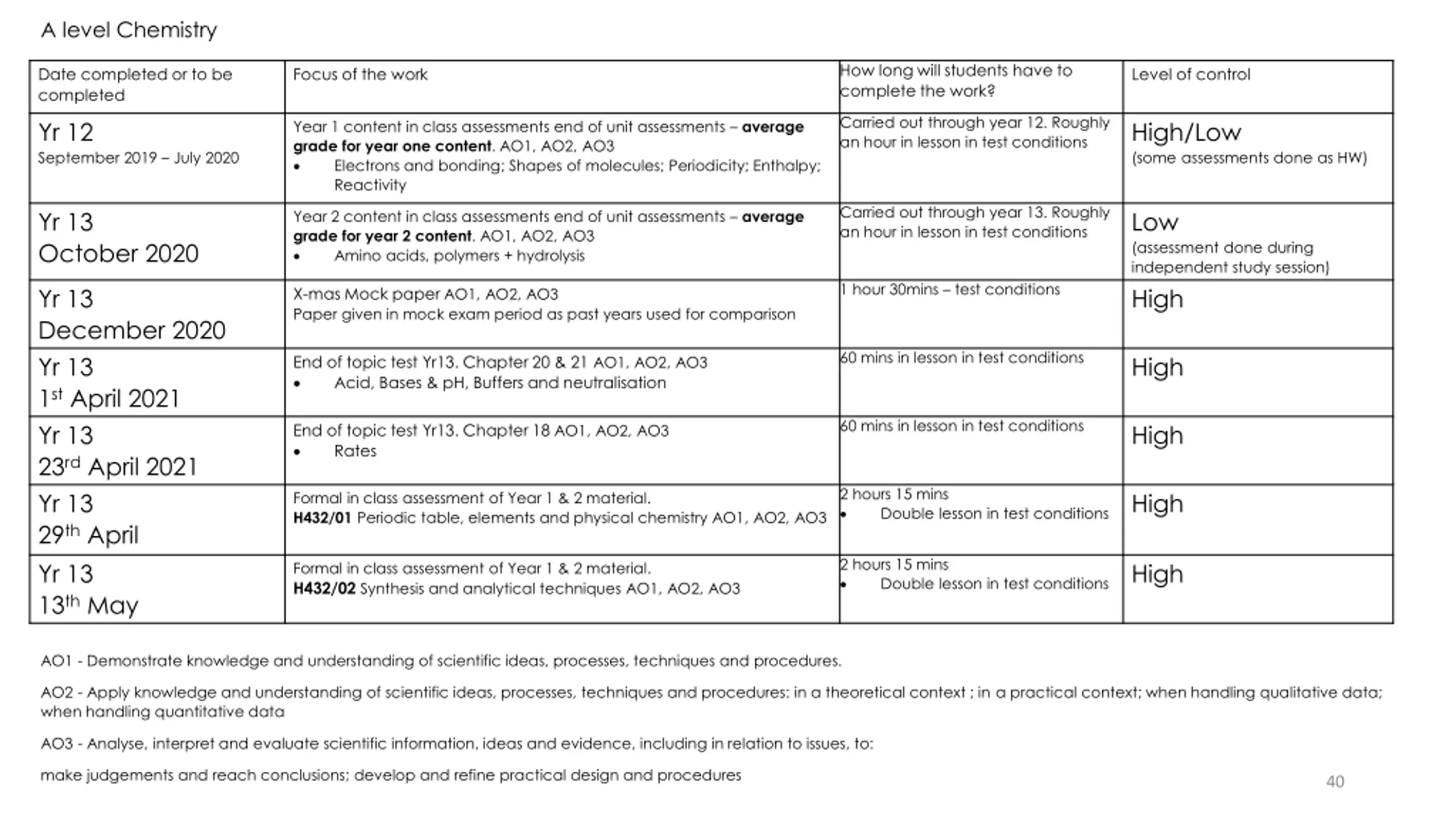 A level Chemistry How long will students have to complete the work? Date completed or to be completed Focus of the work Level of control Carried out through year 12. Roughly an hour in lesson in test conditions Yr 12 September 2019 July 2020 High/Low (some assessments done as HW) Year 1 content in class assessments end of unit assessments average grade for year one content. AO1, AO2, AO3 Electrons and bonding; Shapes of molecules; Periodicity; Enthalpy; Reactivity Carried out through year 13. Roughly an hour in lesson in test conditions Yr 13 October 2020 Low (assessment done during independent study session) High Year 2 content in class assessments end of unit assessments average grade for year 2 content. AO1, AO2, AO3 Amino acids, polymers + hydrolysis 1 hour 30mins test conditions Yr 13 December 2020 Yr 13 1st April 2021 Yr 13 23rd April 2021 Yr 13 29th April Yr 13 13th May X-mas Mock paper AO1, AO2, AO3 Paper given in mock exam period as past years used for comparison 60 mins in lesson in test conditions High End of topic test Yr13. Chapter 20 & 21 AO1, AO2, AO3 Acid, Bases & pH, Buffers and neutralisation 60 mins in lesson in test conditions High End of topic test Yr13. Chapter 18 AO1, AO2, AO3 Rates 2 hours 15 mins Double lesson in test conditions High Formal in class assessment of Year 1 & 2 material. H432/01 Periodic table, elements and physical chemistry AO1, AO2, AO3 2 hours 15 mins Double lesson in test conditions High Formal in class assessment of Year 1 & 2 material. H432/02Synthesis and analytical techniques AO1, AO2, AO3 AO1 - Demonstrate knowledge and understanding of scientific ideas, processes, techniques and procedures. AO2 - Apply knowledge and understanding of scientific ideas, processes, techniques and procedures: in a theoretical context ; in a practical context; when handling qualitative data; when handling quantitative data AO3 - Analyse, interpret and evaluate scientific information, ideas and evidence, including in relation to issues, to: make judgements and reach conclusions; develop and refine practical design and procedures 40
