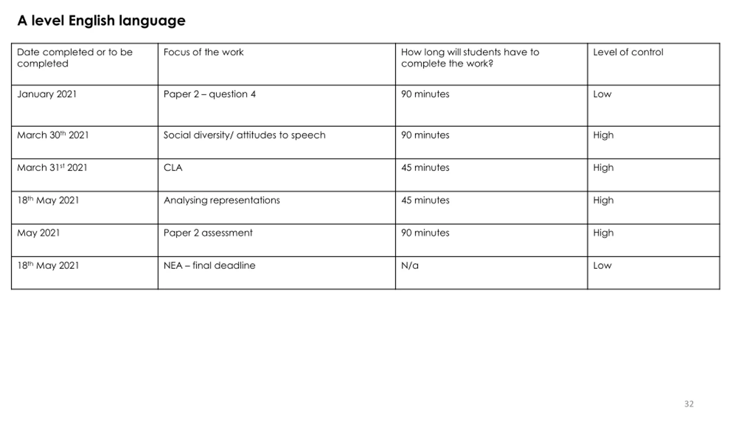 A level English language Date completed or to be completed Focus of the work How long will students have to complete the work? Level of control January 2021 Paper 2 question 4 90 minutes Low March 30th 2021 Social diversity/ attitudes to speech 90 minutes High March 31st 2021 CLA 45 minutes High 18th May 2021 Analysing representations 45 minutes High May 2021 Paper 2 assessment 90 minutes High 18th May 2021 NEA final deadline N/a Low 32