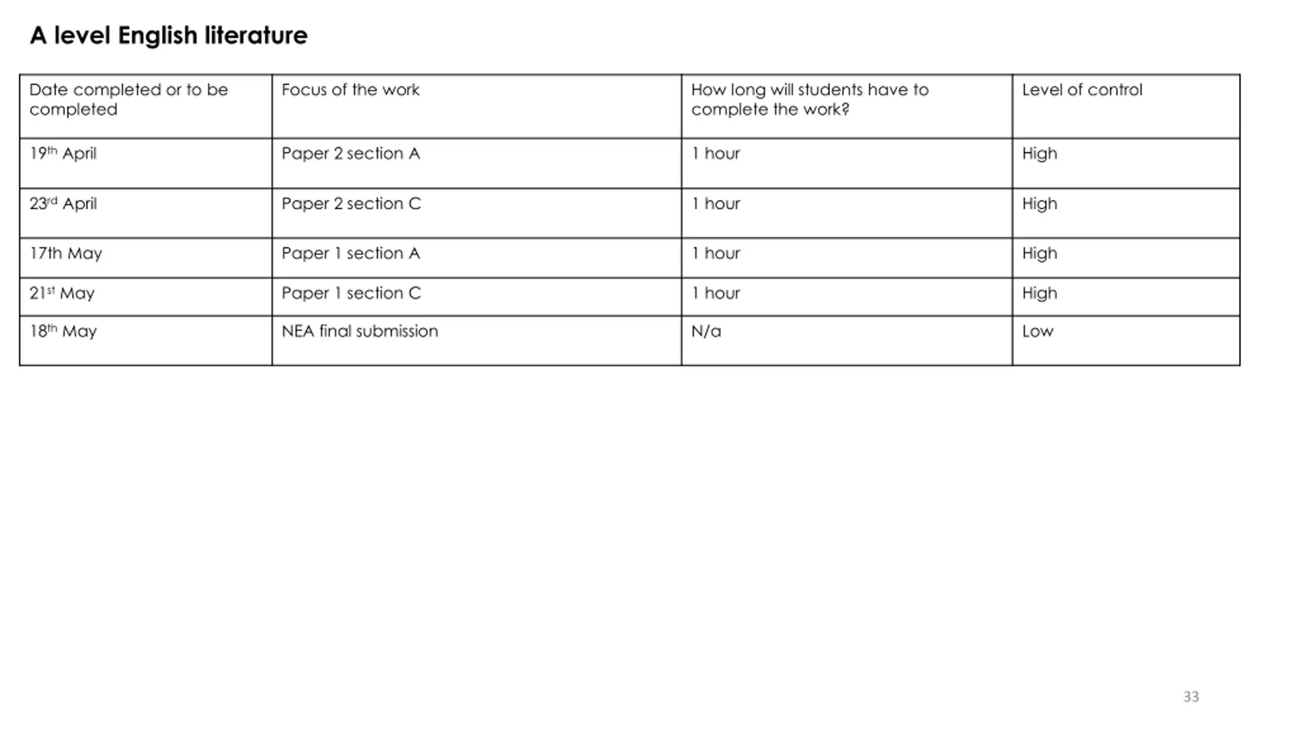 A level English literature Date completed or to be completed Focus of the work How long will students have to complete the work? Level of control 19th April Paper 2 section A 1 hour High 23rd April Paper 2 section C 1 hour High 17th May Paper 1 section A 1 hour High 21st May Paper 1 section C 1 hour High 18th May NEA final submission N/a Low 33