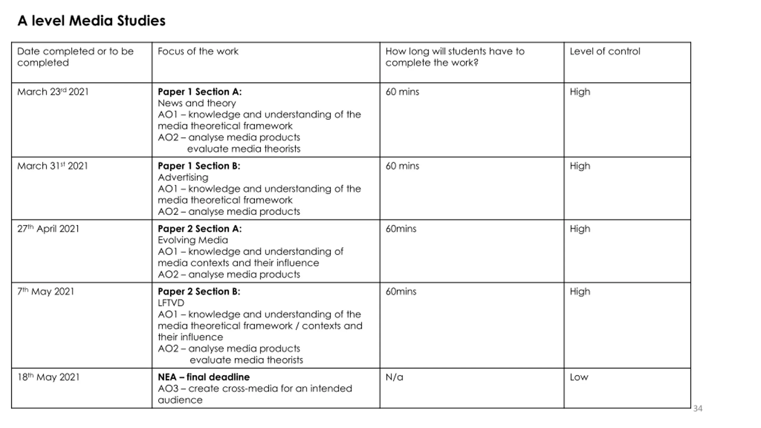 A level Media Studies Date completed or to be completed Focus of the work How long will students have to complete the work? Level of control March 23rd 2021 Paper 1 Section A: News and theory AO1 knowledge and understanding of the media theoretical framework AO2 analyse media products evaluate media theorists 60 mins High March 31st 2021 Paper 1 Section B: Advertising AO1 knowledge and understanding of the media theoretical framework AO2 analyse media products 60 mins High 27th April 2021 Paper 2 Section A: Evolving Media AO1 knowledge and understanding of media contexts and their influence AO2 analyse media products 60mins High 7th May 2021 Paper 2 Section B: LFTVD AO1 knowledge and understanding of the media theoretical framework / contexts and their influence AO2 analyse media products evaluate media theorists 60mins High 18th May 2021 NEA final deadline AO3 create cross-media for an intended audience N/a Low 34