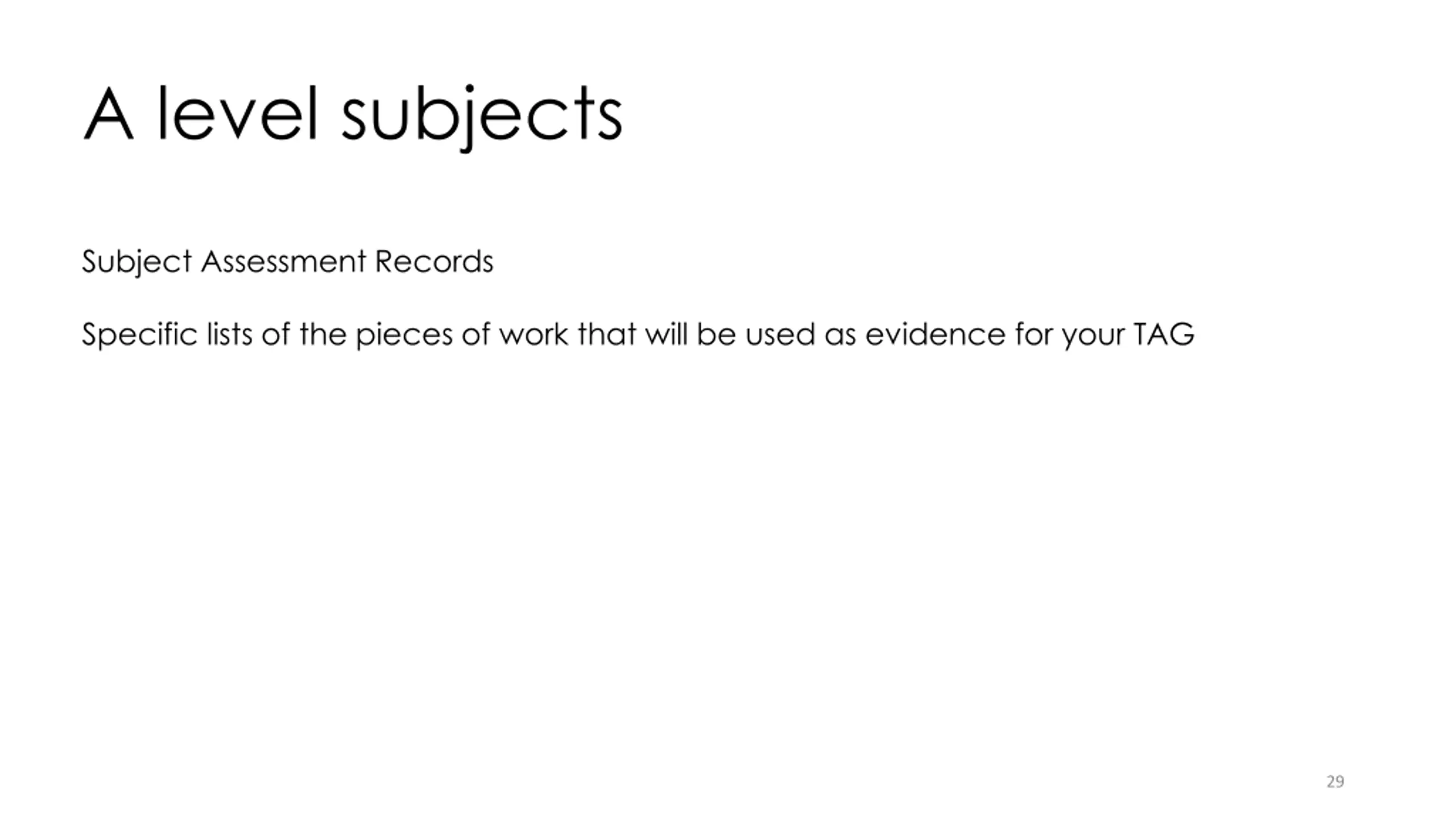 A level subjects Subject Assessment Records Specific lists of the pieces of work that will be used as evidence for your TAG 29