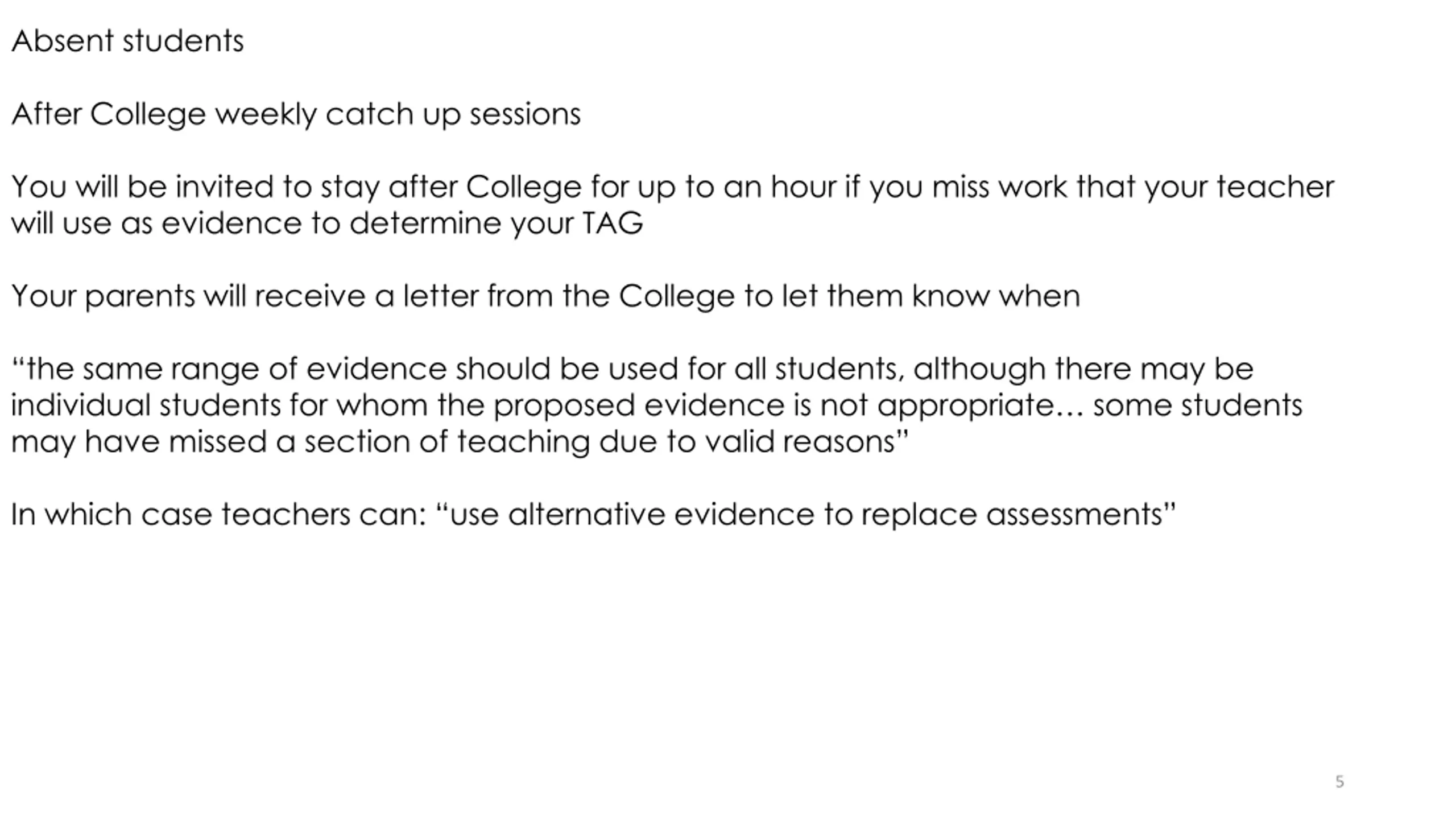 Absent students After College weekly catch up sessions You will be invited to stay after College for up to an hour if you miss work that your teacher will use as evidence to determine your TAG Your parents will receive a letter from the College to let them know when the same range of evidence should be used for all students, although there may be individual students for whom the proposed evidence is not appropriate some students may have missed a section of teaching due to valid reasons In which case teachers can: use alternative evidence to replace assessments 5