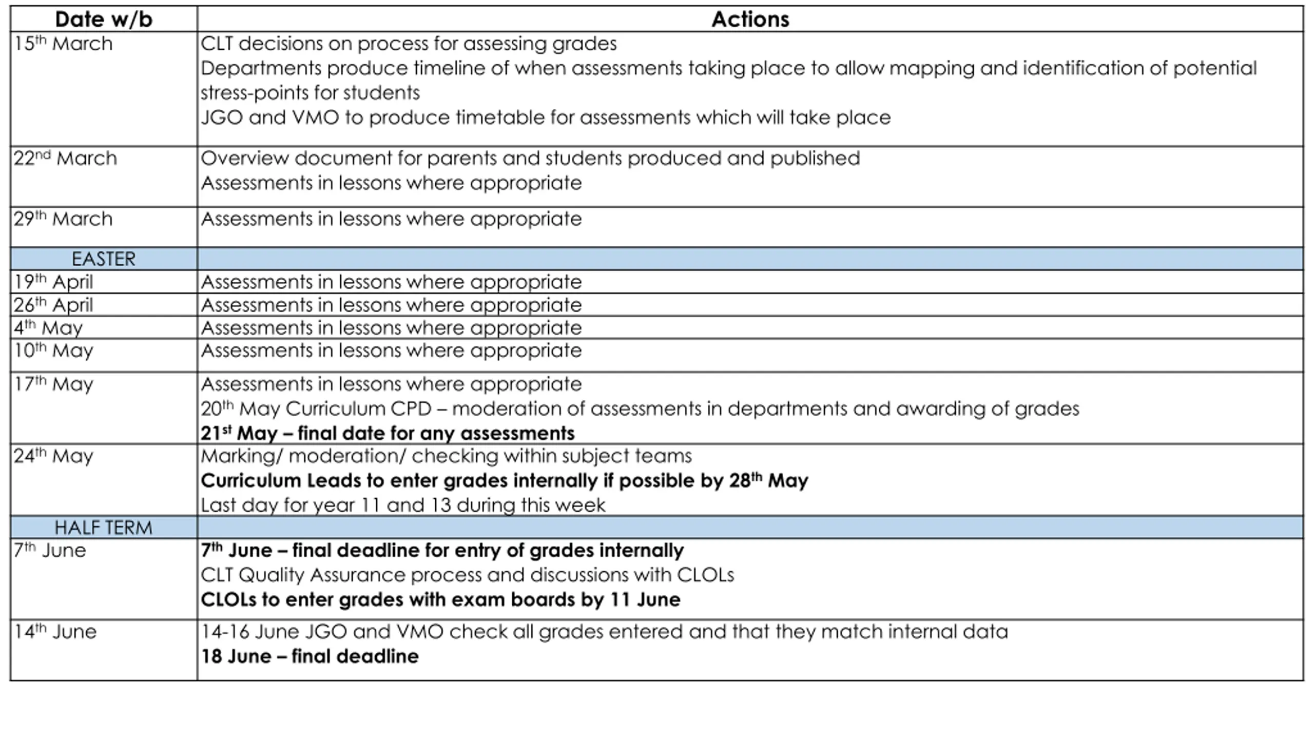 Date w/b 15th March Actions CLT decisions on process for assessing grades Departments produce timeline of when assessments taking place to allow mapping and identification of potential stress-points for students JGO and VMO to produce timetable for assessments which will take place 22nd March Overview document for parents and students produced and published Assessments in lessons where appropriate 29th March Assessments in lessons where appropriate EASTER 19th April 26th April 4th May 10th May Assessments in lessons where appropriate Assessments in lessons where appropriate Assessments in lessons where appropriate Assessments in lessons where appropriate 17th May Assessments in lessons where appropriate 20th May Curriculum CPD moderation of assessments in departments and awarding of grades 21st May final date for any assessments Marking/ moderation/ checking within subject teams Curriculum Leads to enter grades internally if possible by 28th May Last day for year 11 and 13 during this week 24th May HALF TERM 7th June 7th June final deadline for entry of grades internally CLT Quality Assurance process and discussions with CLOLs CLOLs to enter grades with exam boards by 11 June 14-16 June JGO and VMO check all grades entered and that they match internal data 18 June final deadline 14th June