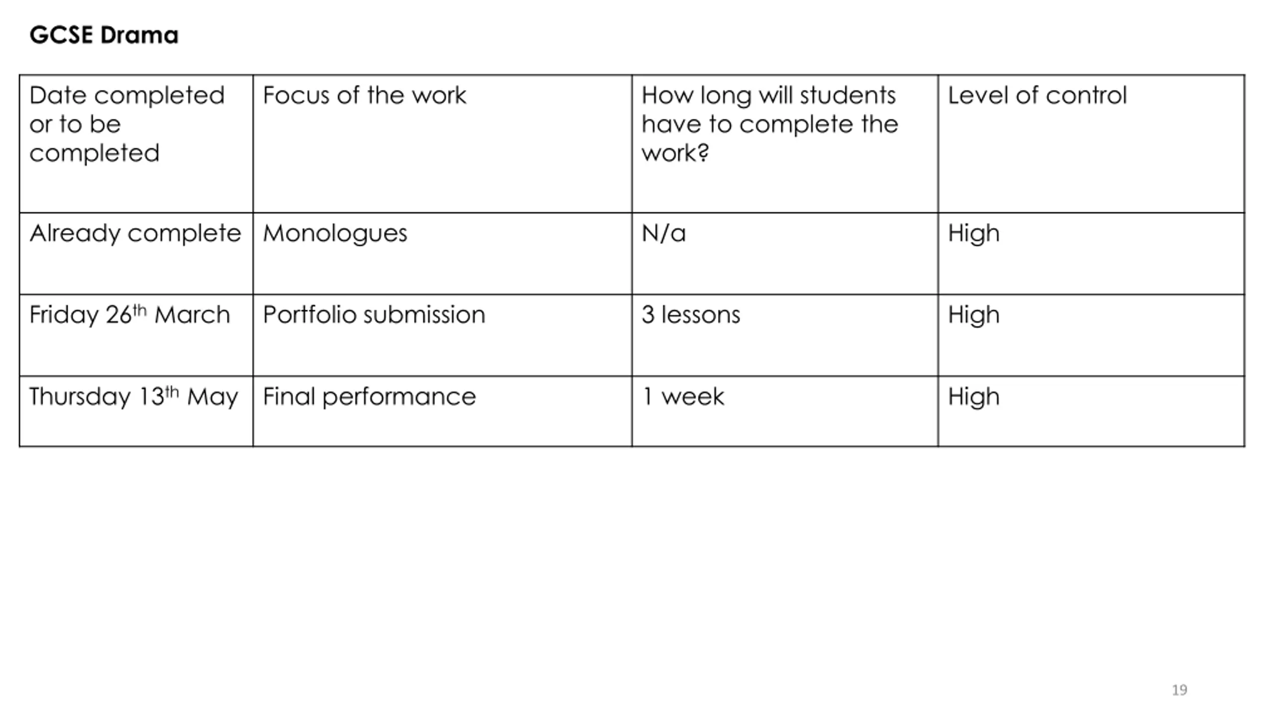 GCSE Drama Date completed or to be completed Focus of the work How long will students have to complete the work? Level of control Already complete Monologues N/a High Friday 26th March Portfolio submission 3 lessons High Thursday 13th May Final performance 1 week High 19