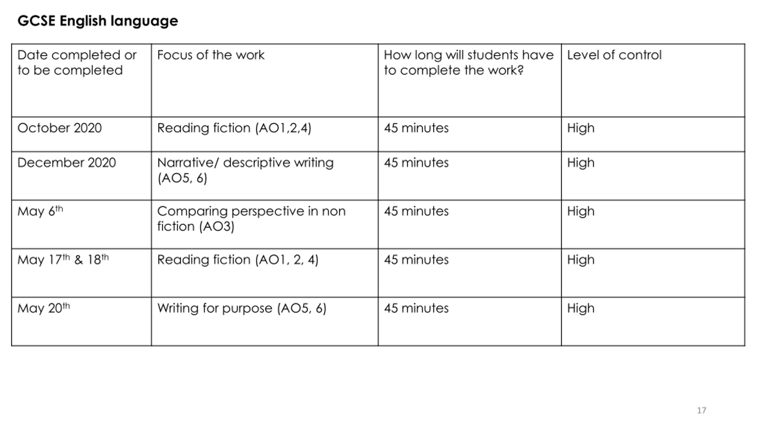 GCSE English language Date completed or to be completed Focus of the work How long will students have to complete the work? Level of control October 2020 Reading fiction (AO1,2,4) 45 minutes High December 2020 Narrative/ descriptive writing (AO5, 6) 45 minutes High May 6th Comparing perspective in non fiction (AO3) 45 minutes High May 17th & 18th Reading fiction (AO1, 2, 4) 45 minutes High May 20th Writing for purpose (AO5, 6) 45 minutes High 17