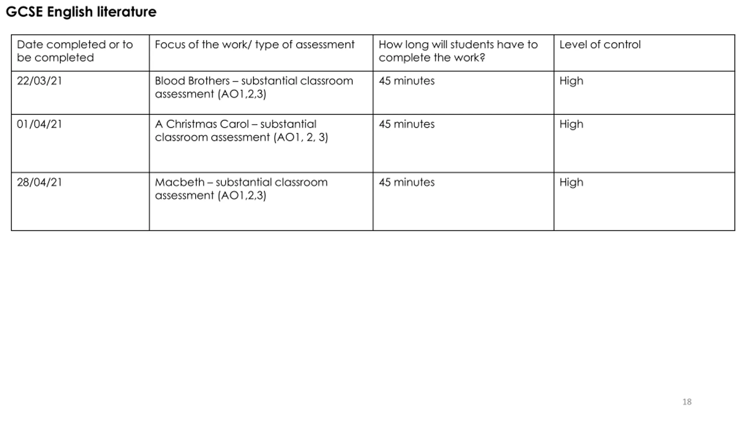 GCSE English literature Date completed or to be completed Focus of the work/ type of assessment How long will students have to complete the work? Level of control 22/03/21 Blood Brothers substantial classroom assessment (AO1,2,3) 45 minutes High 01/04/21 A Christmas Carol substantial classroom assessment (AO1, 2, 3) 45 minutes High 28/04/21 Macbeth substantial classroom assessment (AO1,2,3) 45 minutes High 18