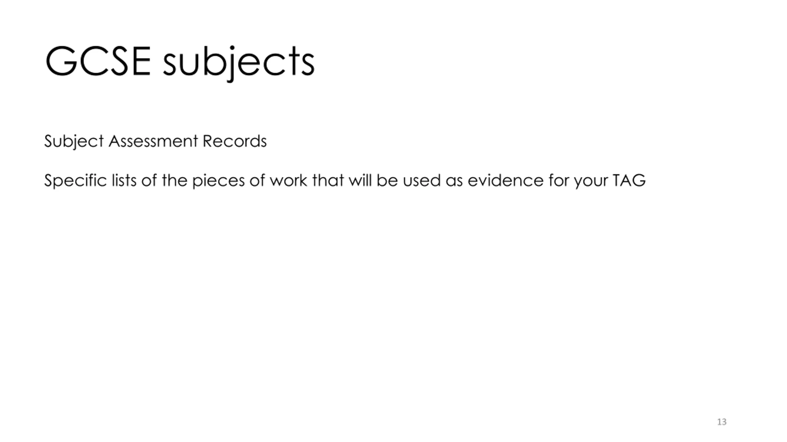 GCSE subjects Subject Assessment Records Specific lists of the pieces of work that will be used as evidence for your TAG 13