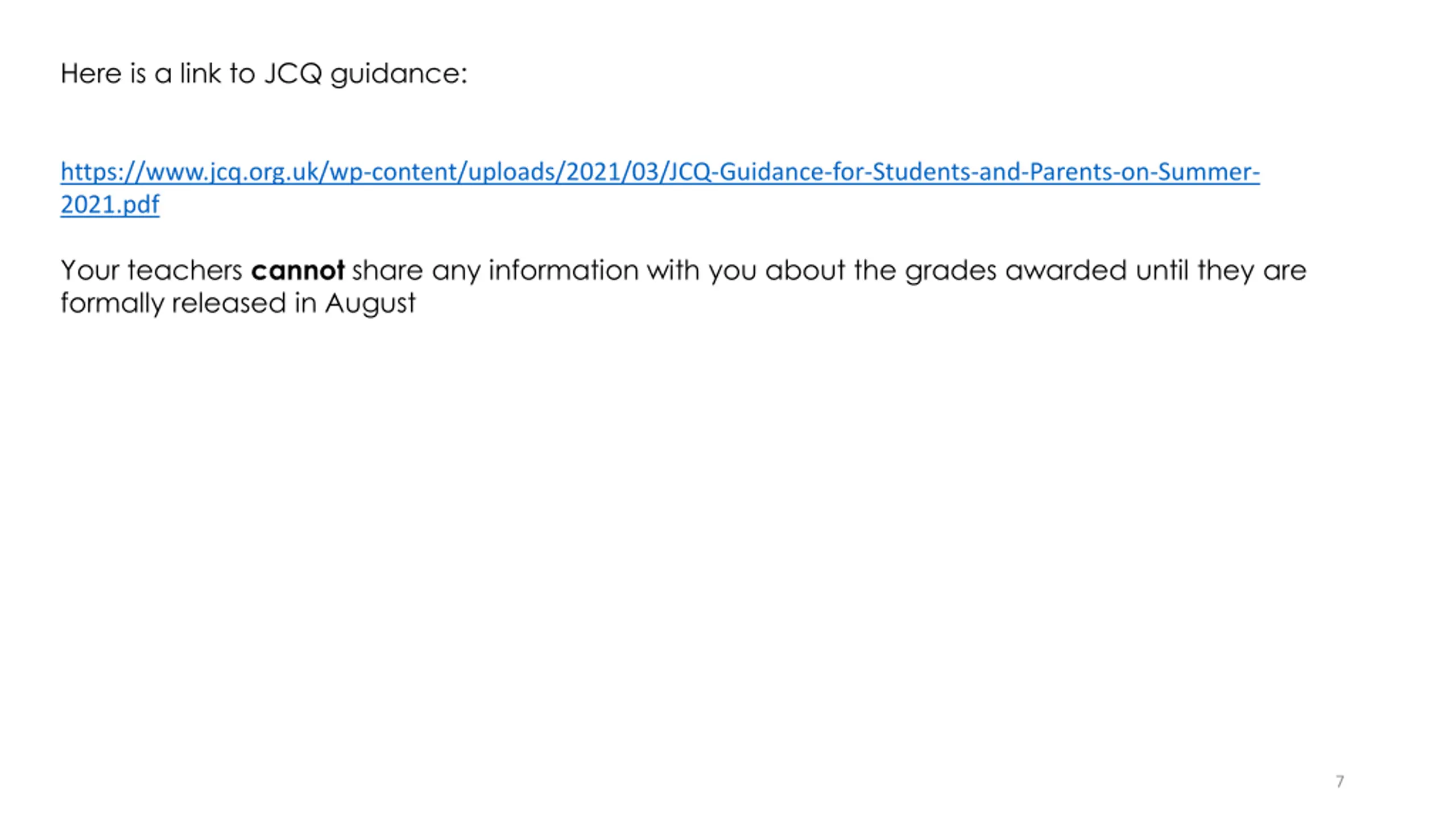 Here is a link to JCQ guidance: https://www.jcq.org.uk/wp-content/uploads/2021/03/JCQ-Guidance-for-Students-and-Parents-on-Summer- 2021.pdf Your teachers cannot share any information with you about the grades awarded until they are formally released in August 7
