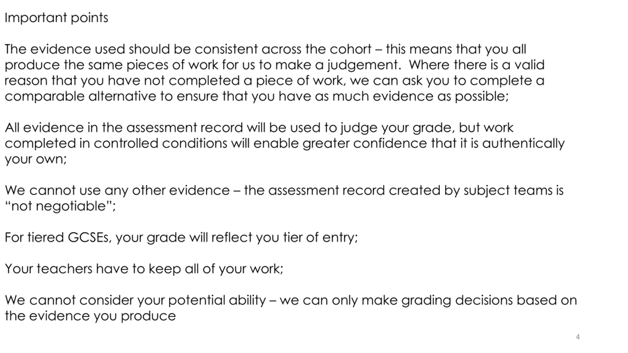 Important points The evidence used should be consistent across the cohort this means that you all produce the same pieces of work for us to make a judgement. Where there is a valid reason that you have not completed a piece of work, we can ask you to complete a comparable alternative to ensure that you have as much evidence as possible; All evidence in the assessment record will be used to judge your grade, but work completed in controlled conditions will enable greater confidence that it is authentically your own; We cannot use any other evidence the assessment record created by subject teams is not negotiable ; For tiered GCSEs, your grade will reflect you tier of entry; Your teachers have to keep all of your work; We cannot consider your potential ability we can only make grading decisions based on the evidence you produce 4