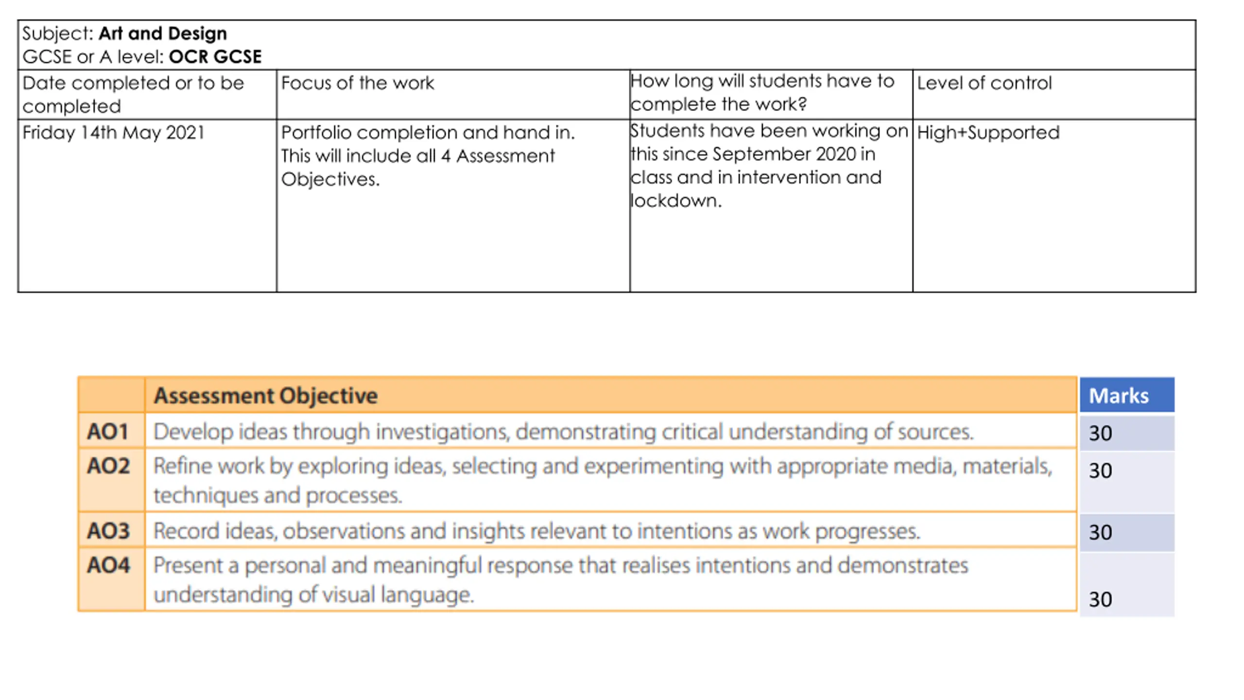 Subject: Art and Design GCSE or A level: OCR GCSE Date completed or to be completed Friday 14th May 2021 How long will students have to complete the work? Students have been working on this since September 2020 in class and in intervention and lockdown. Focus of the work Level of control Portfolio completion and hand in. This will include all 4 Assessment Objectives. High+Supported Marks 30 30 30 30