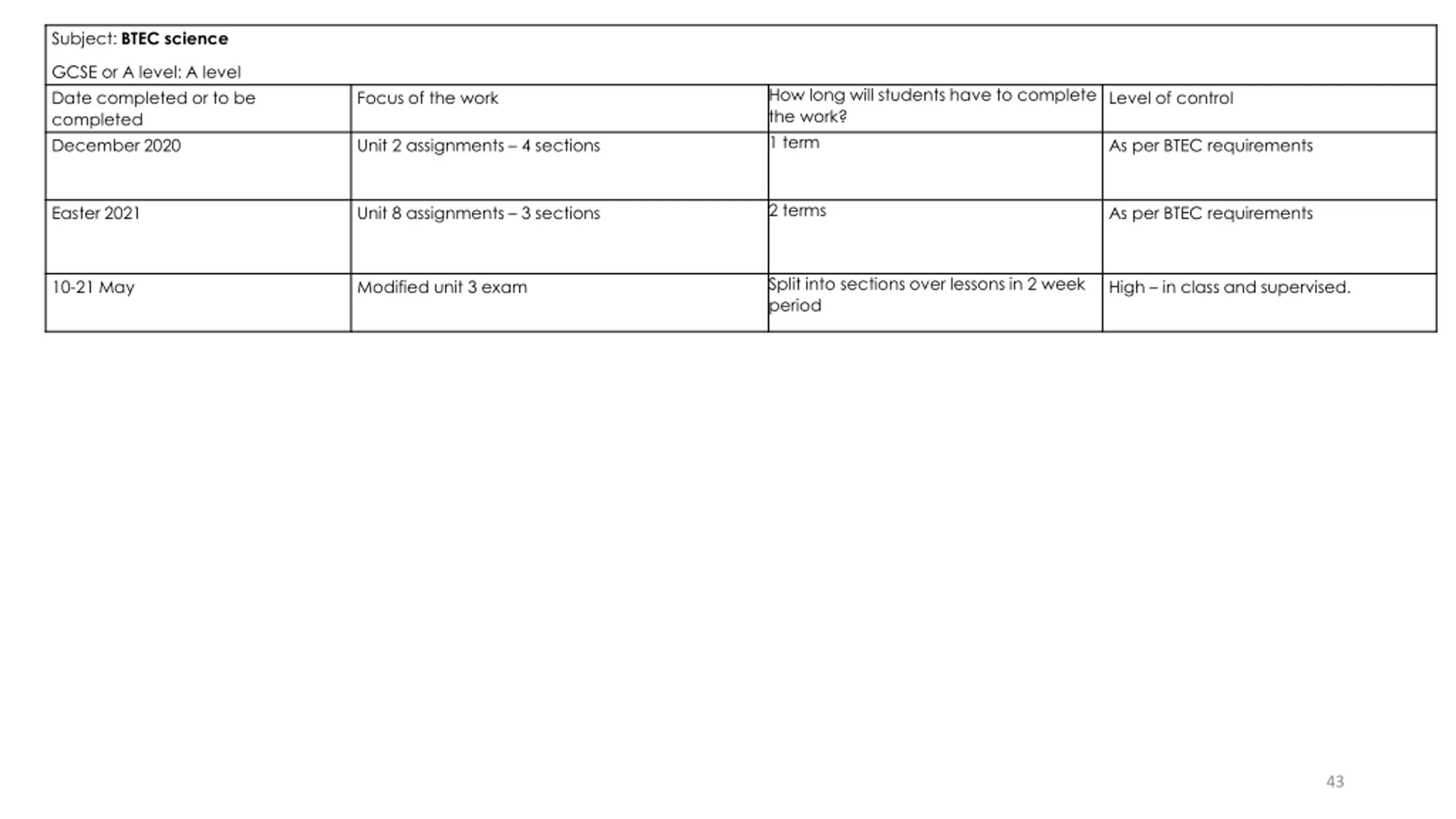 Subject: BTEC science GCSE or A level: A level Date completed or to be completed December 2020 How long will students have to complete the work? 1 term Focus of the work Level of control Unit 2 assignments 4 sections As per BTEC requirements 2 terms Easter 2021 Unit 8 assignments 3 sections As per BTEC requirements Split into sections over lessons in 2 week period 10-21 May Modified unit 3 exam High in class and supervised. 43