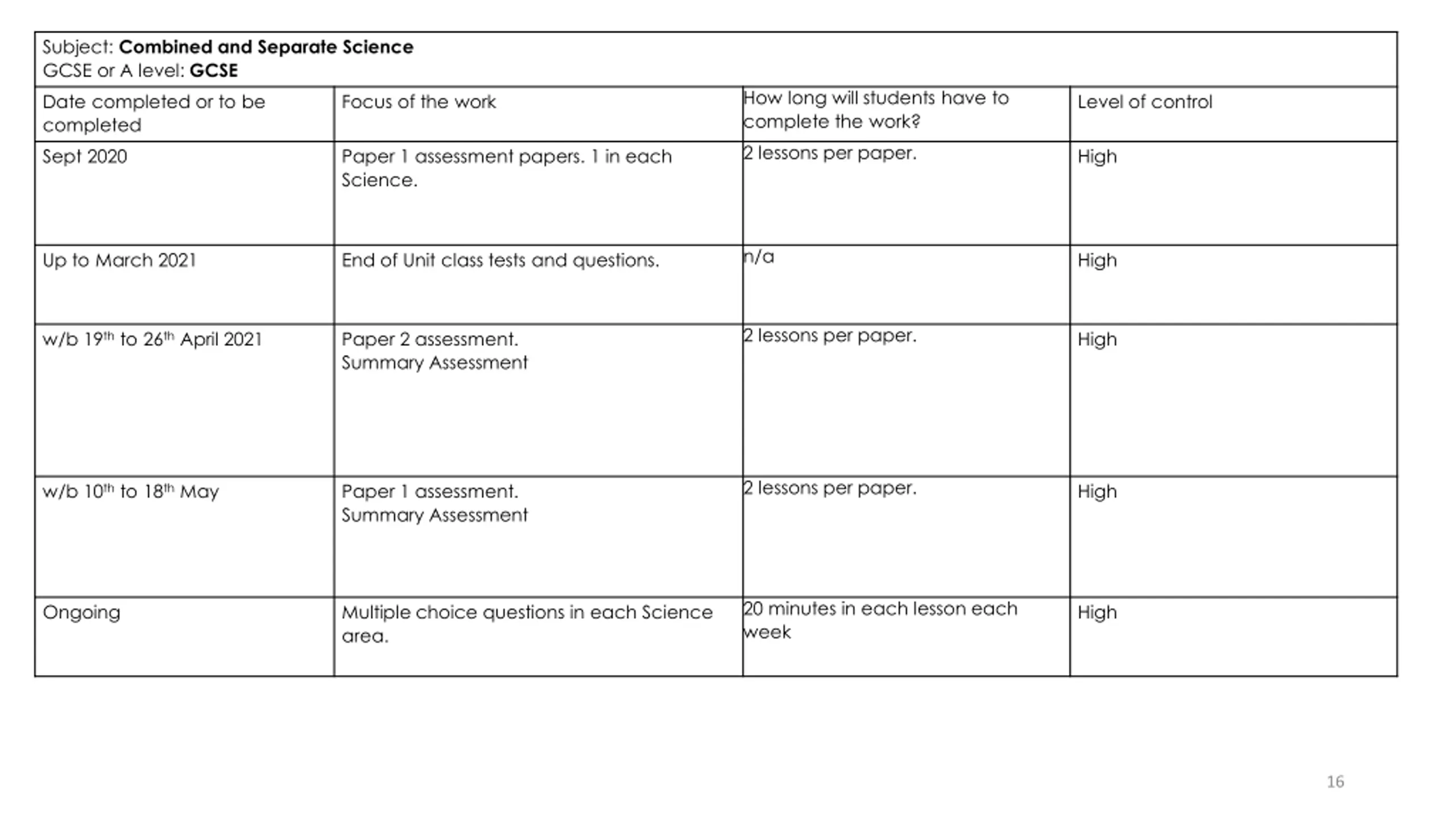 Subject: Combined and Separate Science GCSE or A level: GCSE Date completed or to be completed Sept 2020 How long will students have to complete the work? 2 lessons per paper. Focus of the work Level of control Paper 1 assessment papers. 1 in each Science. High n/a Up to March 2021 End of Unit class tests and questions. High 2 lessons per paper. w/b 19th to 26th April 2021 Paper 2 assessment. Summary Assessment High 2 lessons per paper. w/b 10th to 18th May Paper 1 assessment. Summary Assessment High 20 minutes in each lesson each week Ongoing Multiple choice questions in each Science area. High 16