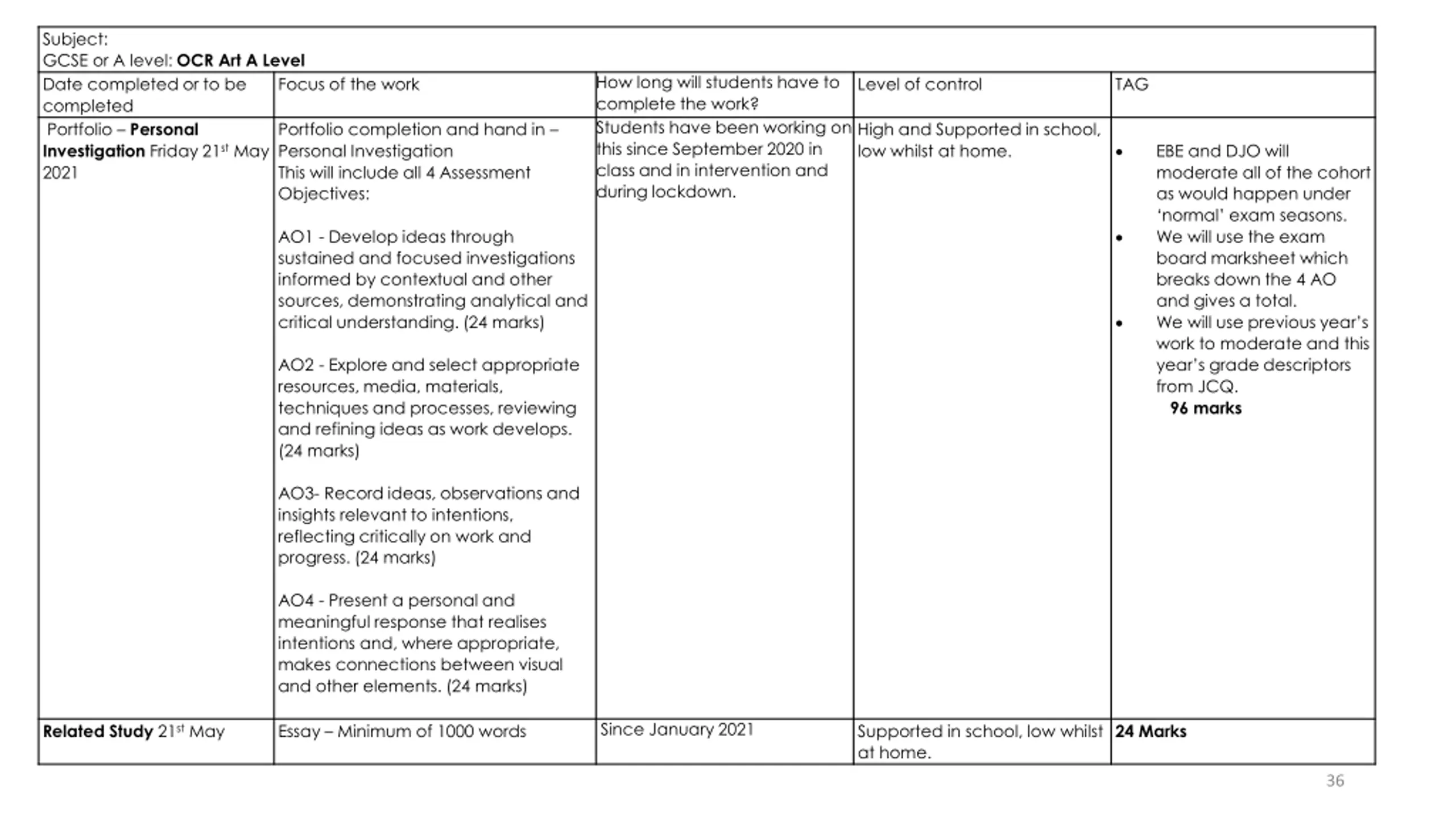 Subject: GCSE or A level: OCR Art A Level Date completed or to be completed Portfolio Personal Investigation Friday 21st May 2021 How long will students have to complete the work? Students have been working on this since September 2020 in class and in intervention and during lockdown. Focus of the work Level of control TAG Portfolio completion and hand in Personal Investigation This will include all 4 Assessment Objectives: High and Supported in school, low whilst at home. EBE and DJO will moderate all of the cohort as would happen under normal exam seasons. We will use the exam board marksheet which breaks down the 4 AO and gives a total. We will use previous year s work to moderate and this year s grade descriptors from JCQ. 96 marks AO1 - Develop ideas through sustained and focused investigations informed by contextual and other sources, demonstrating analytical and critical understanding. (24 marks) AO2 - Explore and select appropriate resources, media, materials, techniques and processes, reviewing and refining ideas as work develops. (24 marks) AO3- Record ideas, observations and insights relevant to intentions, reflecting critically on work and progress. (24 marks) AO4 - Present a personal and meaningful response that realises intentions and, where appropriate, makes connections between visual and other elements. (24 marks) Since January 2021 Related Study 21st May Essay Minimum of 1000 words Supported in school, low whilst at home. 24 Marks 36