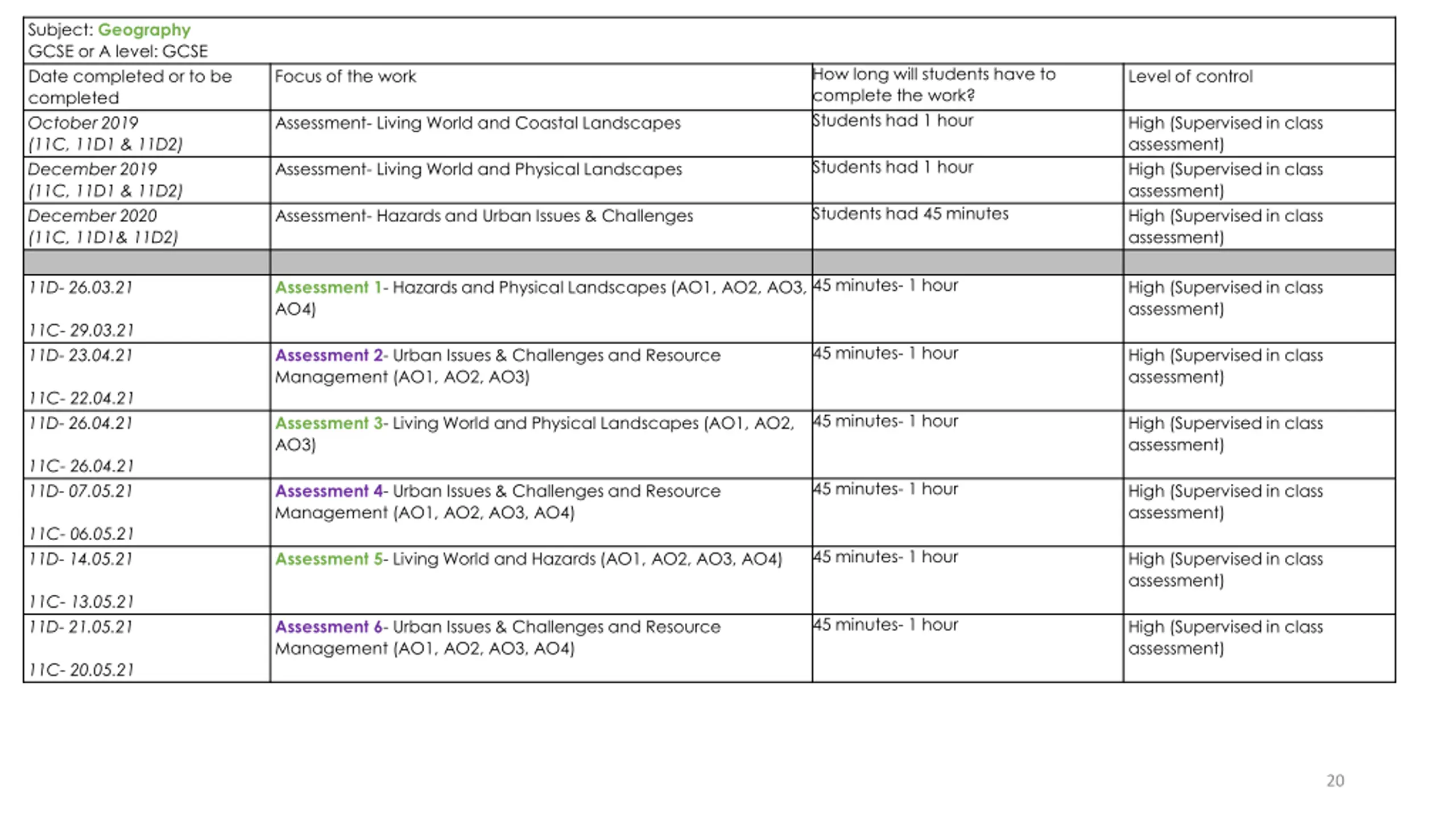Subject: Geography GCSE or A level: GCSE Date completed or to be completed October 2019 (11C, 11D1 & 11D2) December 2019 (11C, 11D1 & 11D2) December 2020 (11C, 11D1& 11D2) How long will students have to complete the work? Students had 1 hour Focus of the work Level of control Assessment- Living World and Coastal Landscapes High (Supervised in class assessment) High (Supervised in class assessment) High (Supervised in class assessment) Students had 1 hour Assessment- Living World and Physical Landscapes Students had 45 minutes Assessment- Hazards and Urban Issues & Challenges 45 minutes- 1 hour 11D- 26.03.21 Assessment 1- Hazards and Physical Landscapes (AO1, AO2, AO3, AO4) High (Supervised in class assessment) 11C- 29.03.21 11D- 23.04.21 45 minutes- 1 hour Assessment 2- Urban Issues & Challenges and Resource Management (AO1, AO2, AO3) High (Supervised in class assessment) 11C- 22.04.21 11D- 26.04.21 45 minutes- 1 hour Assessment 3- Living World and Physical Landscapes (AO1, AO2, AO3) High (Supervised in class assessment) 11C- 26.04.21 11D- 07.05.21 45 minutes- 1 hour Assessment 4- Urban Issues & Challenges and Resource Management (AO1, AO2, AO3, AO4) High (Supervised in class assessment) 11C- 06.05.21 11D- 14.05.21 45 minutes- 1 hour Assessment 5- Living World and Hazards (AO1, AO2, AO3, AO4) High (Supervised in class assessment) 11C- 13.05.21 11D- 21.05.21 45 minutes- 1 hour Assessment 6- Urban Issues & Challenges and Resource Management (AO1, AO2, AO3, AO4) High (Supervised in class assessment) 11C- 20.05.21 20