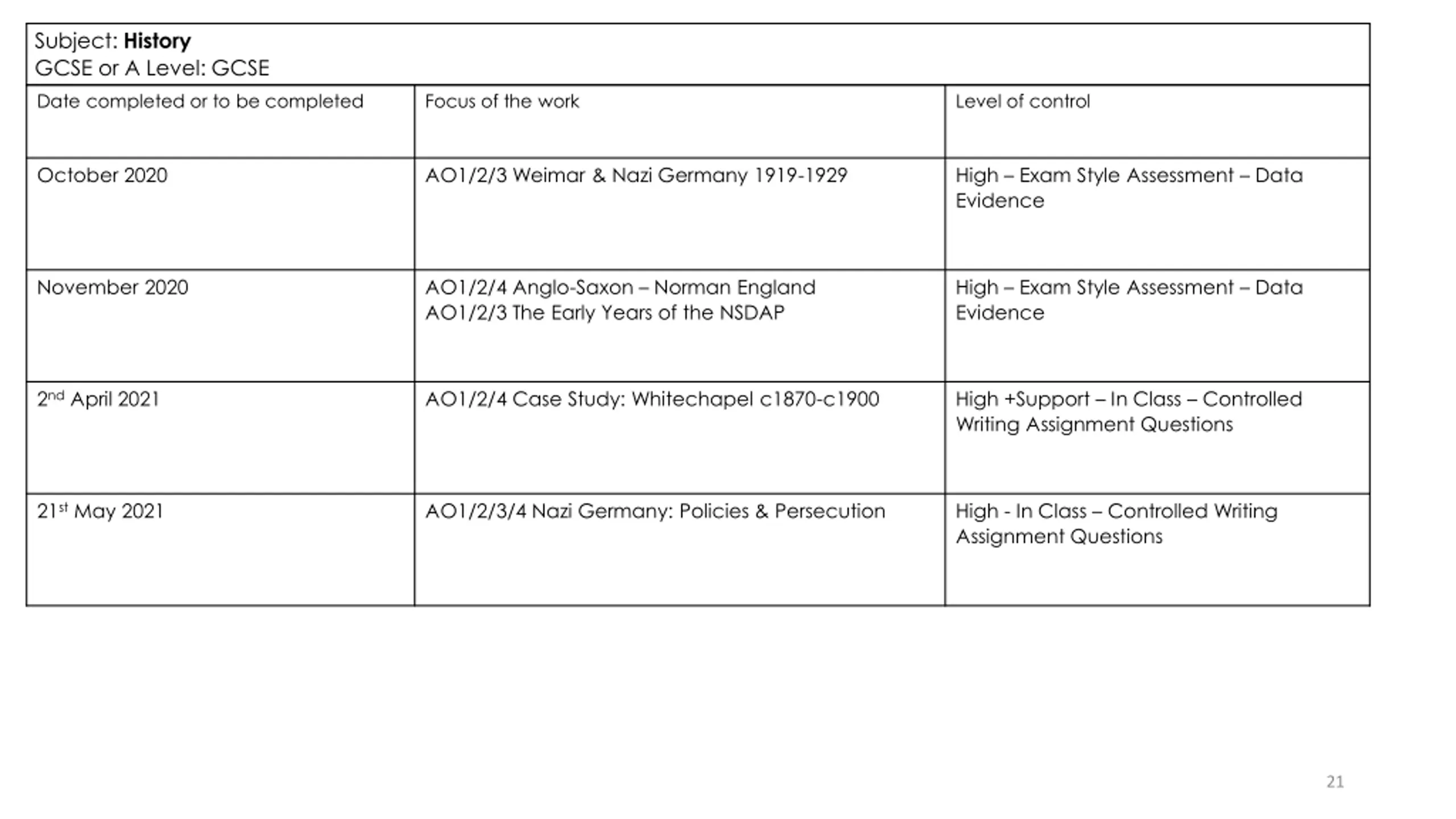 Subject: History GCSE or A Level: GCSE Date completed or to be completed Focus of the work Level of control October 2020 AO1/2/3 Weimar & Nazi Germany 1919-1929 High Exam Style Assessment Data Evidence November 2020 AO1/2/4 Anglo-Saxon Norman England AO1/2/3 The Early Years of the NSDAP High Exam Style Assessment Data Evidence 2nd April 2021 AO1/2/4 Case Study: Whitechapel c1870-c1900 High +Support In Class Controlled Writing Assignment Questions 21st May 2021 AO1/2/3/4 Nazi Germany: Policies & Persecution High - In Class Controlled Writing Assignment Questions 21