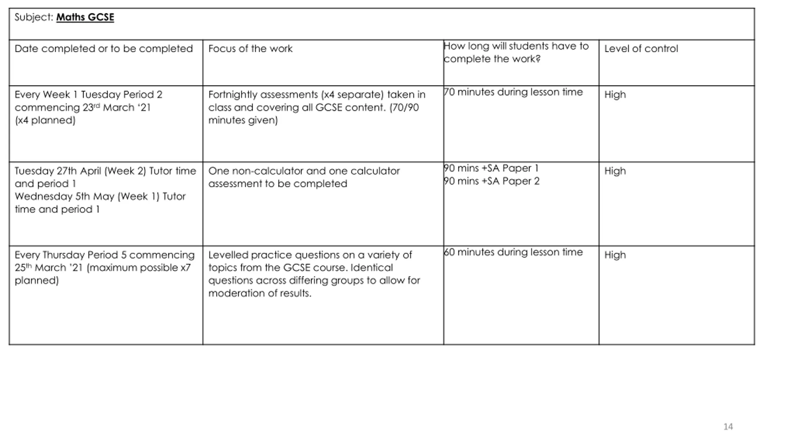 Subject: Maths GCSE How long will students have to complete the work? Date completed or to be completed Focus of the work Level of control 70 minutes during lesson time Every Week 1 Tuesday Period 2 commencing 23rdMarch 21 (x4 planned) Fortnightly assessments (x4 separate) taken in class and covering all GCSE content. (70/90 minutes given) High 90 mins +SA Paper 1 90 mins +SA Paper 2 Tuesday 27th April (Week 2) Tutor time and period 1 Wednesday 5th May (Week 1) Tutor time and period 1 One non-calculator and one calculator assessment to be completed High 60 minutes during lesson time Every Thursday Period 5 commencing 25thMarch 21 (maximum possible x7 planned) Levelled practice questions on a variety of topics from the GCSE course. Identical questions across differing groups to allow for moderation of results. High 14