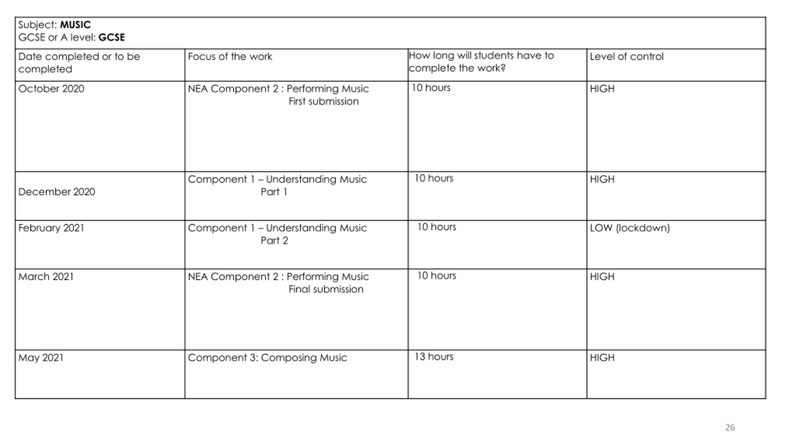 Subject: MUSIC GCSE or A level: GCSE How long will students have to complete the work? Date completed or to be completed Focus of the work Level of control 10 hours October 2020 NEA Component 2 : Performing Music HIGH First submission 10 hours Component 1 Understanding Music Part 1 HIGH December 2020 10 hours February 2021 Component 1 Understanding Music Part 2 LOW (lockdown) 10 hours March 2021 NEA Component 2 : Performing Music HIGH Final submission 13 hours May 2021 Component 3: Composing Music HIGH 26