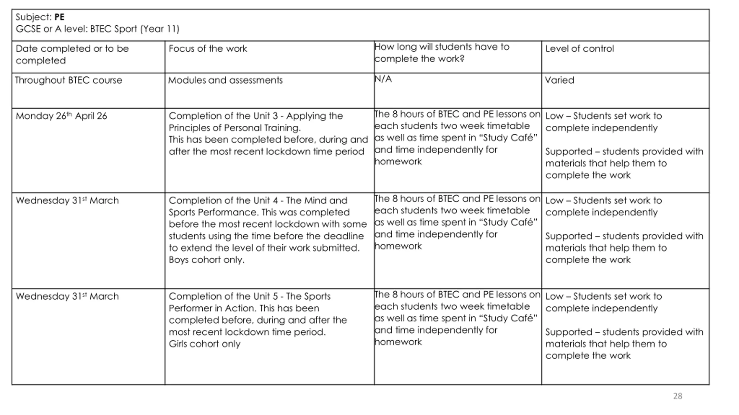 Subject: PE GCSE or A level: BTEC Sport (Year 11) How long will students have to complete the work? Date completed or to be completed Focus of the work Level of control N/A Throughout BTEC course Modules and assessments Varied The 8 hours of BTEC and PE lessons on each students two week timetable as well as time spent in Study Caf and time independently for homework Monday 26th April 26 Completion of the Unit 3 - Applying the Principles of Personal Training. This has been completed before, during and after the most recent lockdown time period Low Students set work to complete independently Supported students provided with materials that help them to complete the work The 8 hours of BTEC and PE lessons on each students two week timetable as well as time spent in Study Caf and time independently for homework Wednesday 31st March Completion of the Unit 4 - The Mind and Sports Performance. This was completed before the most recent lockdown with some students using the time before the deadline to extend the level of their work submitted. Boys cohort only. Low Students set work to complete independently Supported students provided with materials that help them to complete the work The 8 hours of BTEC and PE lessons on each students two week timetable as well as time spent in Study Caf and time independently for homework Wednesday 31st March Completion of the Unit 5 - The Sports Performer in Action. This has been completed before, during and after the most recent lockdown time period. Girls cohort only Low Students set work to complete independently Supported students provided with materials that help them to complete the work 28