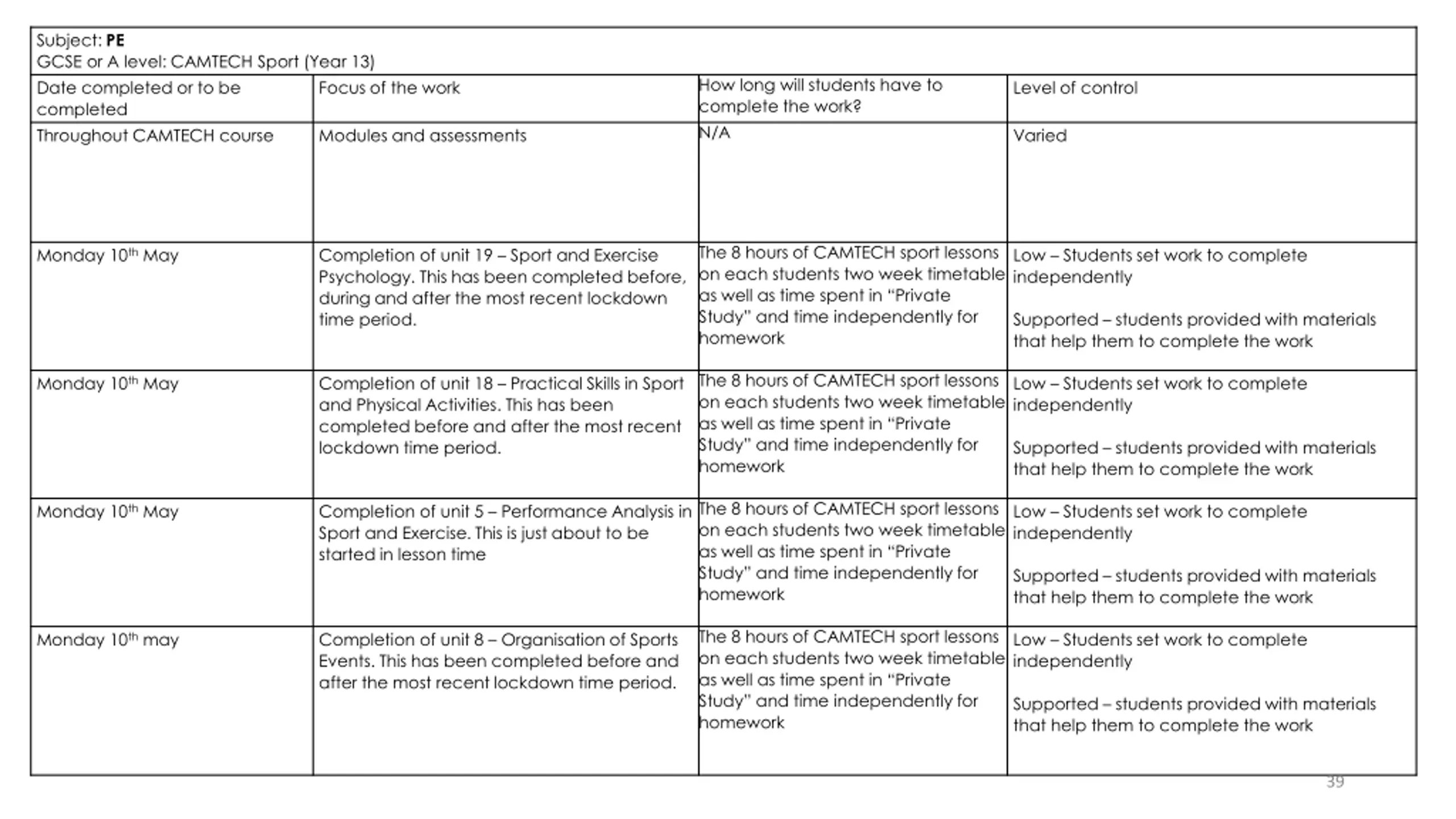 Subject: PE GCSE or A level: CAMTECH Sport (Year 13) Date completed or to be completed Throughout CAMTECH course How long will students have to complete the work? N/A Focus of the work Level of control Modules and assessments Varied The 8 hours of CAMTECH sport lessons on each students two week timetable as well as time spent in Private Study and time independently for homework Monday 10th May Completion of unit 19 Sport and Exercise Psychology. This has been completed before, during and after the most recent lockdown time period. Low Students set work to complete independently Supported students provided with materials that help them to complete the work The 8 hours of CAMTECH sport lessons on each students two week timetable as well as time spent in Private Study and time independently for homework Monday 10th May Completion of unit 18 Practical Skills in Sport and Physical Activities. This has been completed before and after the most recent lockdown time period. Low Students set work to complete independently Supported students provided with materials that help them to complete the work The 8 hours of CAMTECH sport lessons on each students two week timetable as well as time spent in Private Study and time independently for homework Monday 10th May Completion of unit 5 Performance Analysis in Sport and Exercise. This is just about to be started in lesson time Low Students set work to complete independently Supported students provided with materials that help them to complete the work The 8 hours of CAMTECH sport lessons on each students two week timetable as well as time spent in Private Study and time independently for homework Monday 10th may Completion of unit 8 Organisation of Sports Events. This has been completed before and after the most recent lockdown time period. Low Students set work to complete independently Supported students provided with materials that help them to complete the work 39