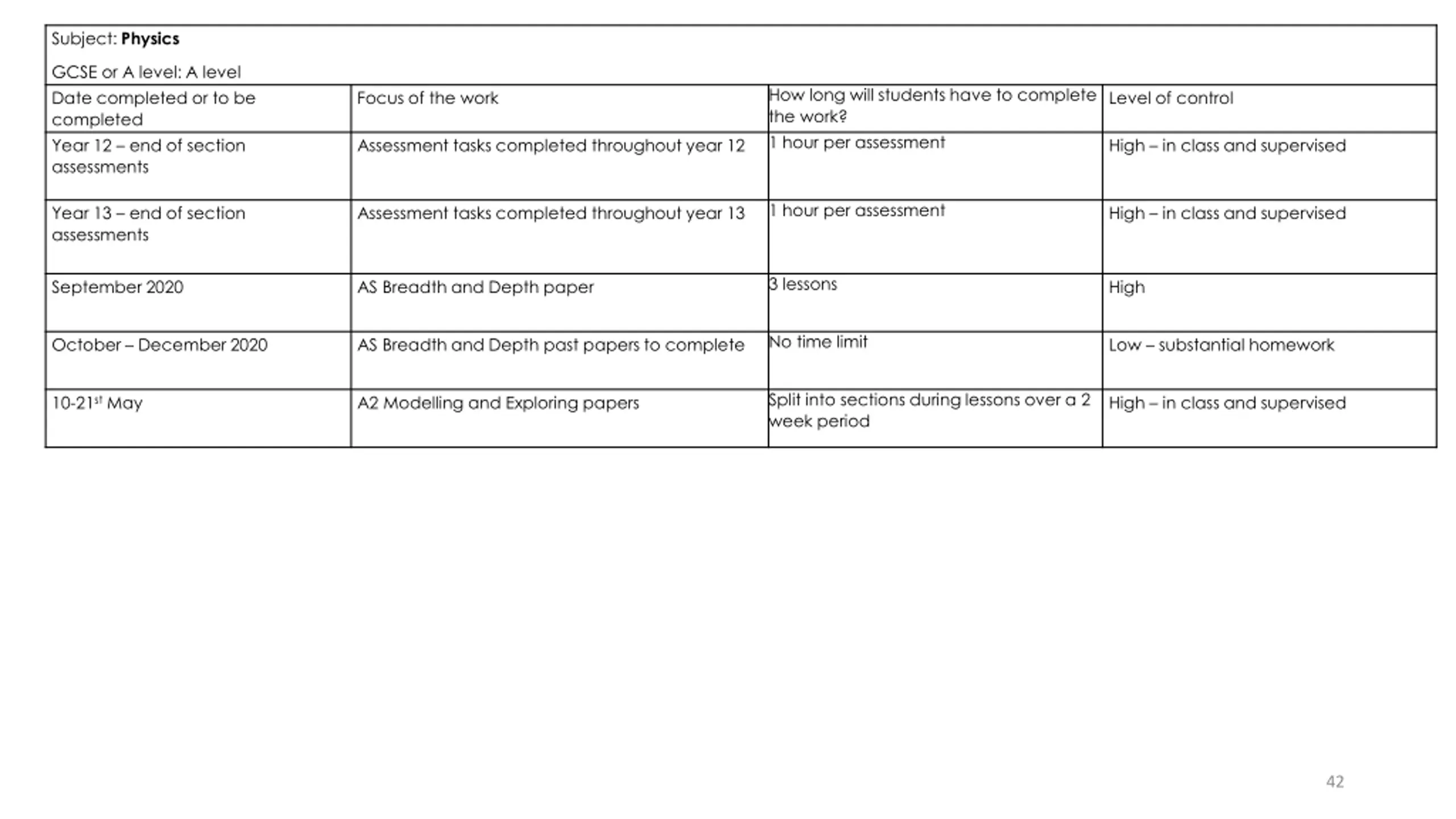 Subject: Physics GCSE or A level: A level Date completed or to be completed Year 12 end of section assessments How long will students have to complete the work? 1 hour per assessment Focus of the work Level of control Assessment tasks completed throughout year 12 High in class and supervised 1 hour per assessment Year 13 end of section assessments Assessment tasks completed throughout year 13 High in class and supervised 3 lessons September 2020 AS Breadth and Depth paper High No time limit October December 2020 AS Breadth and Depth past papers to complete Low substantial homework Split into sections during lessons over a 2 week period 10-21st May A2 Modelling and Exploring papers High in class and supervised 42