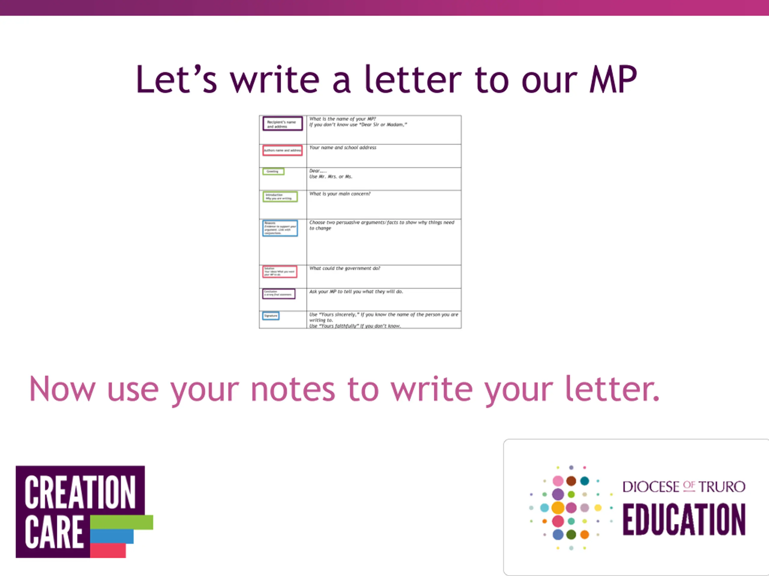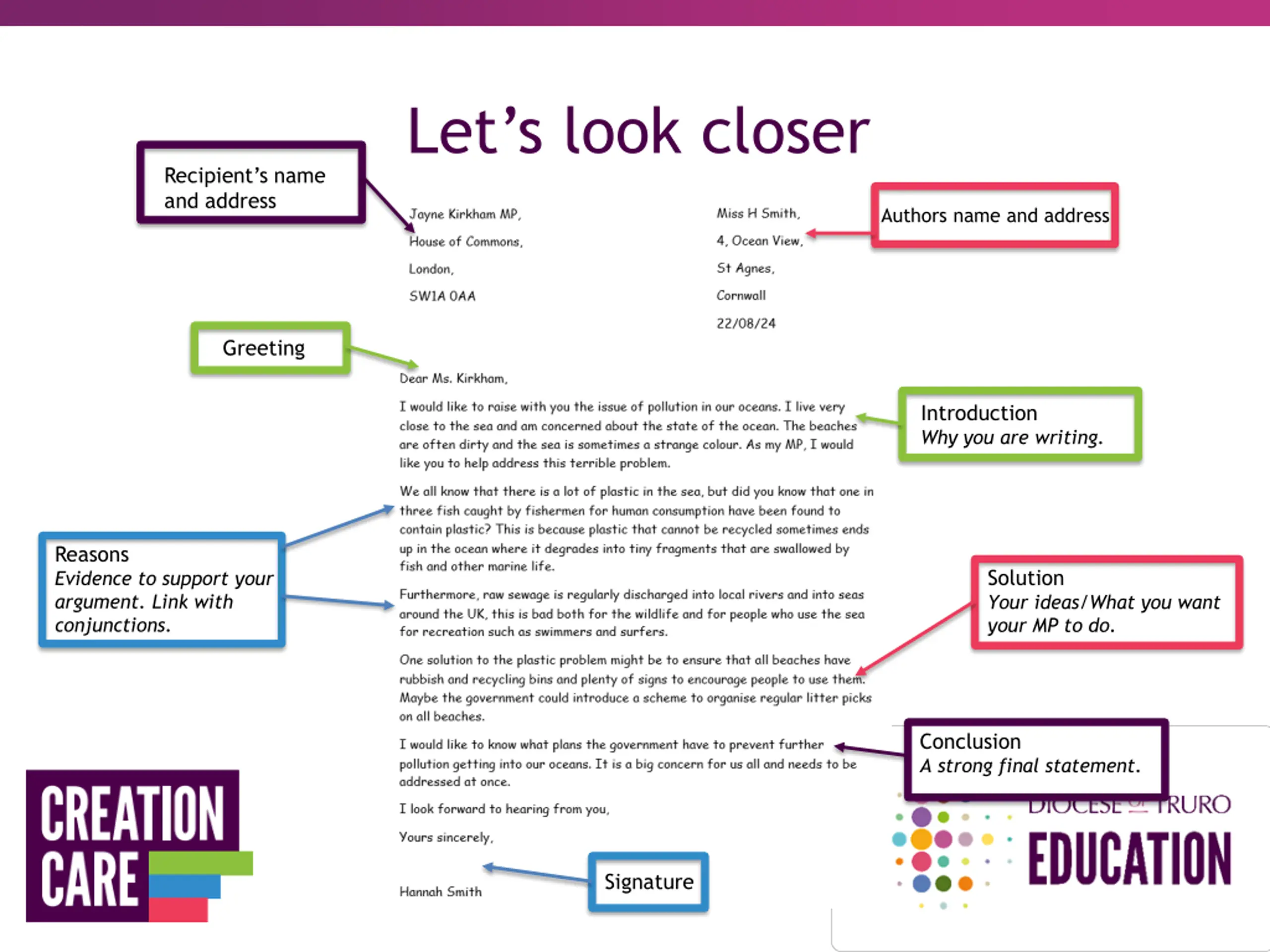 Lets look closer Recipient s name and address Authors name and address Greeting Introduction Why you are writing. Reasons Evidence to support your argument. Link with conjunctions. Solution Your ideas/What you want your MP to do. Conclusion A strong final statement. Signature