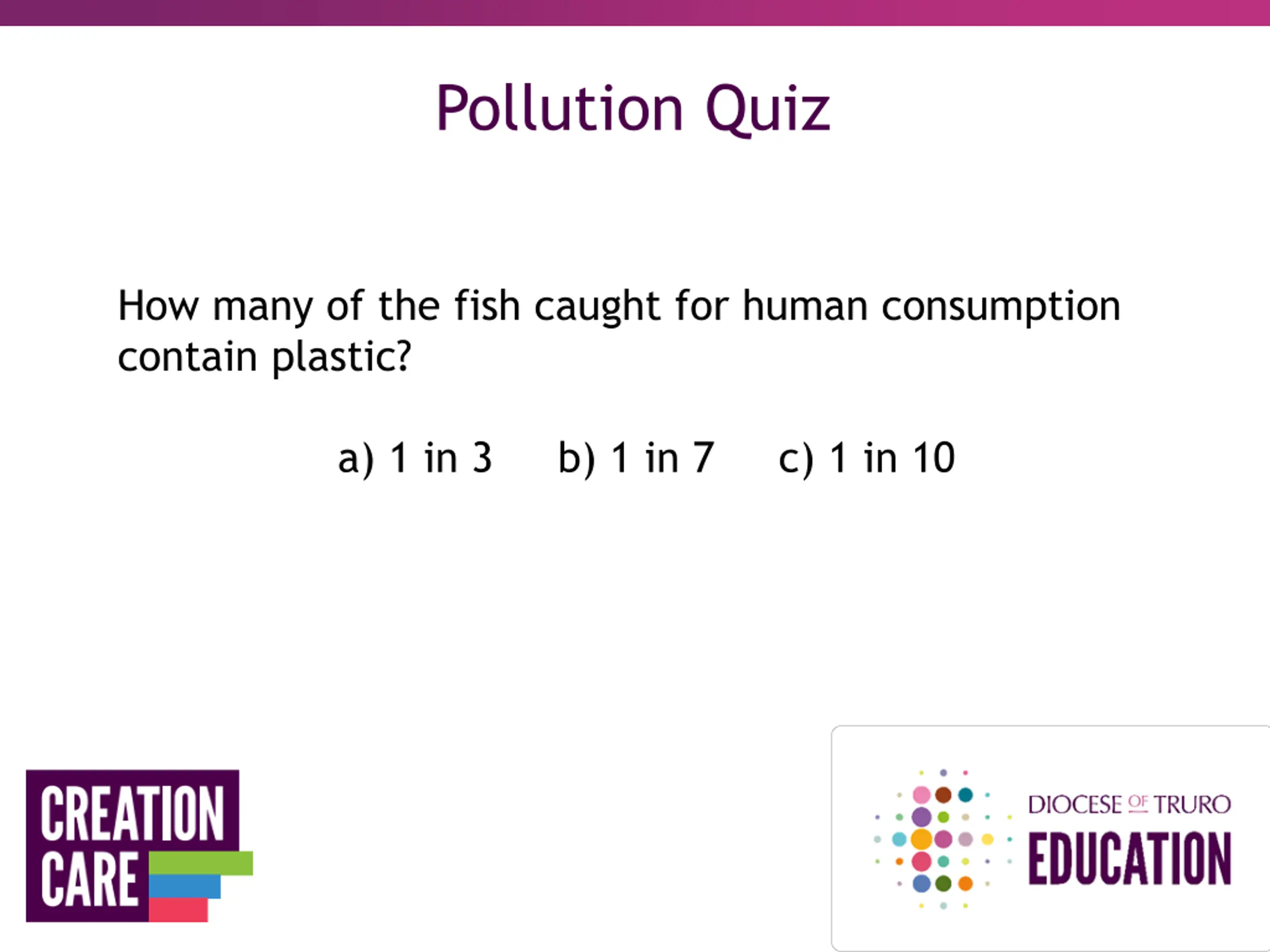 Pollution Quiz How many of the fish caught for human consumption contain plastic? a) 1 in 3 b) 1 in 7 c) 1 in 10